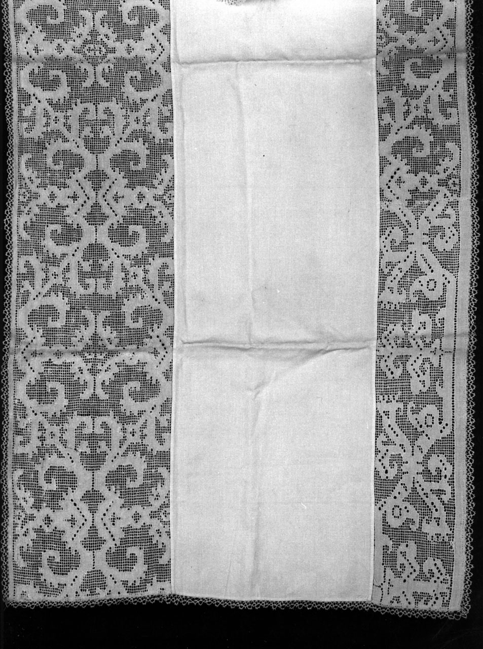 Il manufatto, di lino bianco, è ricamato in sfilato alle due estremità con lo stesso disegno ripetuto raddoppiato nel bordo più alto. Il disegno nasce dalla tela di fondo non lavorata e rifinita agli orli a punto cordonetto e occhiello. Il fondo, a piccoli riquadri regolari, è ricavato dalla sfilatura della tela, togliendo quattro fili nel senso dell'altezza e della larghezza, e ricamato a punto cordonetto. Il disegno geometrico è composto da un motivo ad asse centrale, divaricato all' estremità in due appoggi leggermente ondulati, e tangente nella parte opposta con tronchi stilizzati, da cui nascono foglie ondulate, disposti in diagonale a creare una greca a zig zag. Nel bordo di maggiori dimensioni il disegno, usato raddoppiato e rovesciato, crea l'effetto diversificato e i tronchi definiscono una forma quadrangolare con al centro un elaborato motivo Il manufatto è rifinito negli orli esterni da una finitura di puntine rotondeggianti, eseguite a fuselli