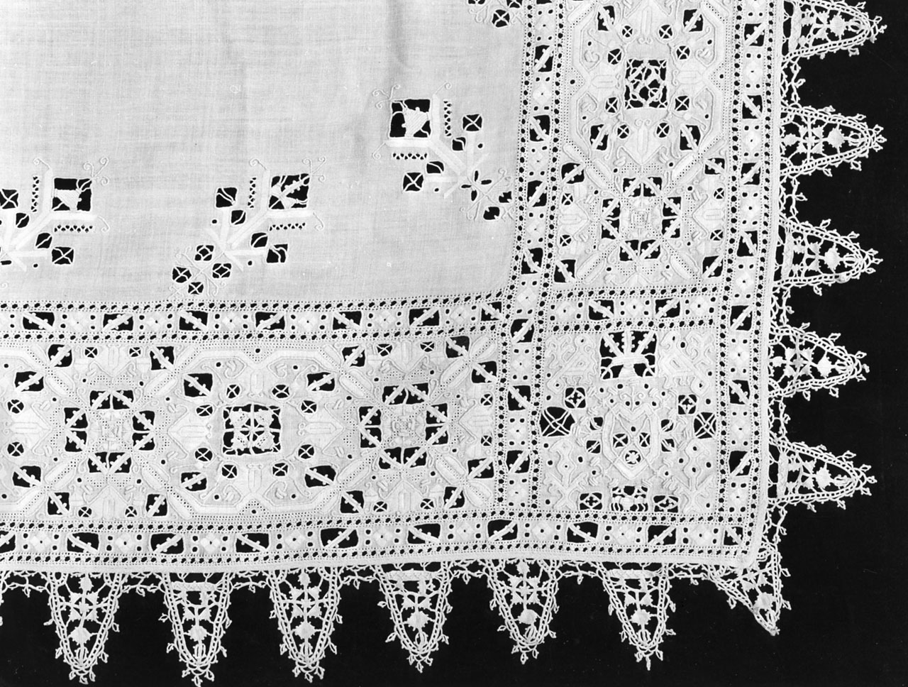 La tovaglia, di forma rettangolare, è decorata lungo tutti i suoi lati da un ricamo ricavato dal taglio e dalla sfilatura della tela, creando un disegno geometrico, nato dall'abbinamento di quadrati di varia dimensione diversamente riempiti. Intorno alle aperture della tela sono ricamati in bianco, a rilievo, cornici geometriche e motivi stilizzati, disposti intorno ad aperture quadrate di piccole dimensioni, decorate all'interno da una barretta, variamente orientata. In alto e in basso è delimitato da due bordi di dimensioni ridotte, dove i quadrati, disposti con ritmo regolare, sono riempiti da una barretta in diagonale, orientata in modo alternato Nella parte centrale della tovaglia sono motivi geometrici, anch'essi ricavati dal taglio e dalla sfilatura, che ricordano un tralcio culminante in un quadrato, riempito ad ago con motivi geometrici differenziati. Gli orli esterni sono decorate con lunghe punte triangolari eseguite ad ago e collegate tra di loro, tramite barrette arricchite da leggeri festoni Il lavoro è eseguito a punto piatto, riccio, cordonetto obliquo, sfilature, punti tagliati riempito a punto tela, festone e punto avvolto