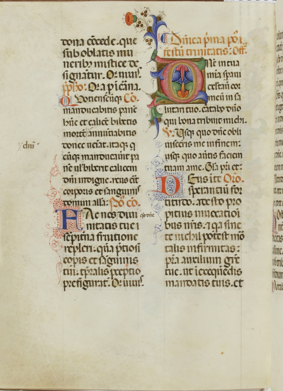 Iniziale fogliata media caudata D (Domine), rubr., Dominica prima post festum trinitatis. Offitium. Corpo della lettera rosa, fondo azzurro con foglie disposte specularmente: rosa e azzurre e rosse e verdi; la coda si conclude nel margine superiore con un fiorellino arancione