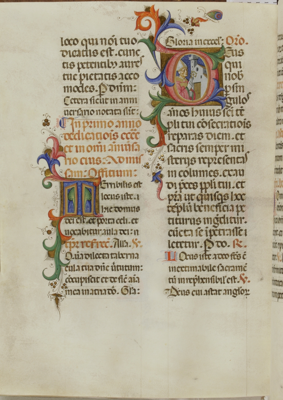 Iniziale fogliata media caudata T (Terribilis est), rubr. In primo anno dedicationis ecclesie et in omni anniversario eius. Ad missam. Offitium. Corpo della lettera azzurro, fondo anch'esso azzurro, diviso dall'asta centrale in due parti speculari, ciascuna con una foglia verde e un'altra azzurra