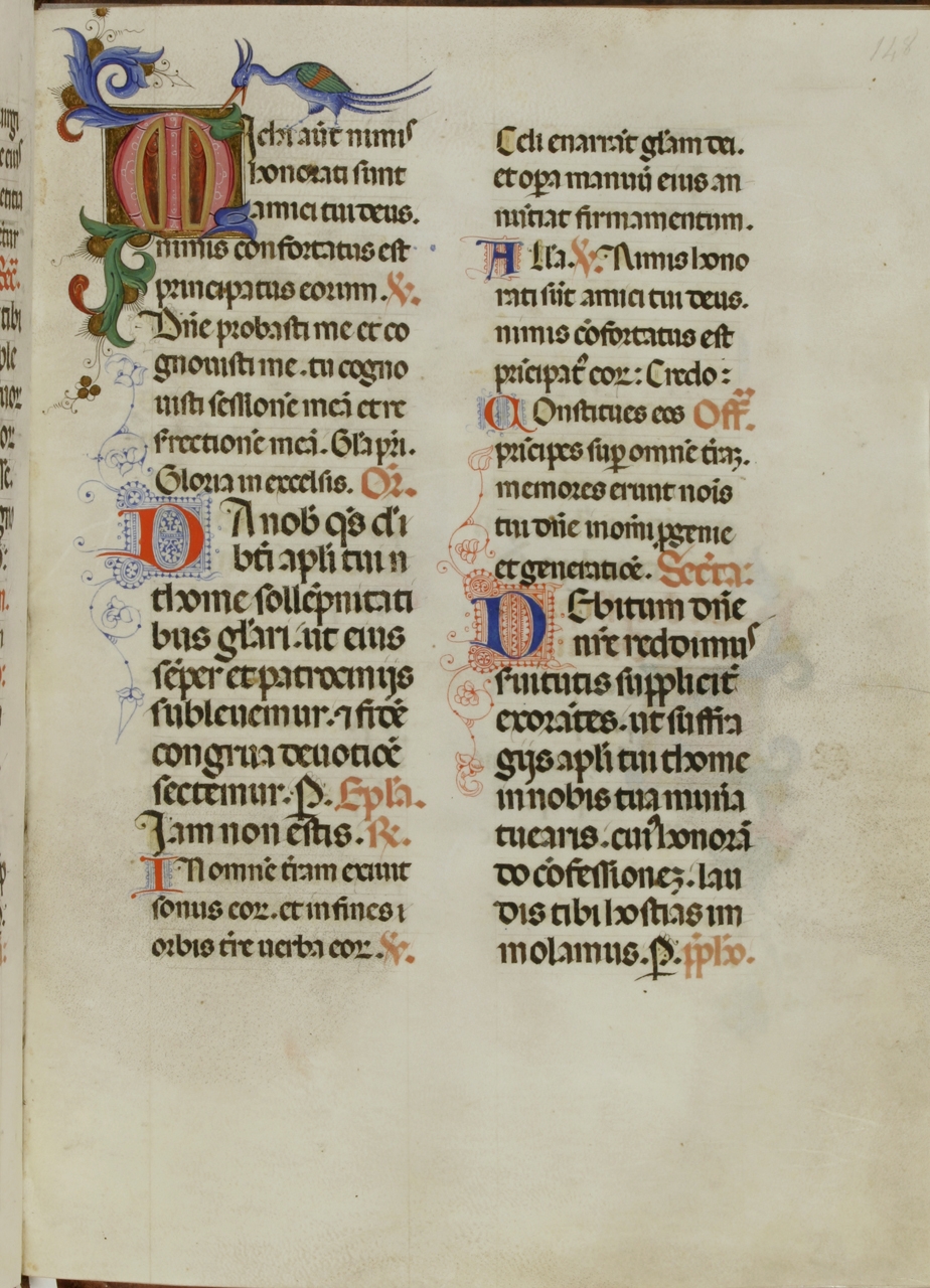 Iniziale fogliata media caudata M (Michi autem), rubr. a c. 147v, Sancti Tome apostoli. Offitium. Corpo della lettera rosa, fondo rosso decorato con due pesci; sul margine superiore è un uccello dalle piume azzurre e verdi
