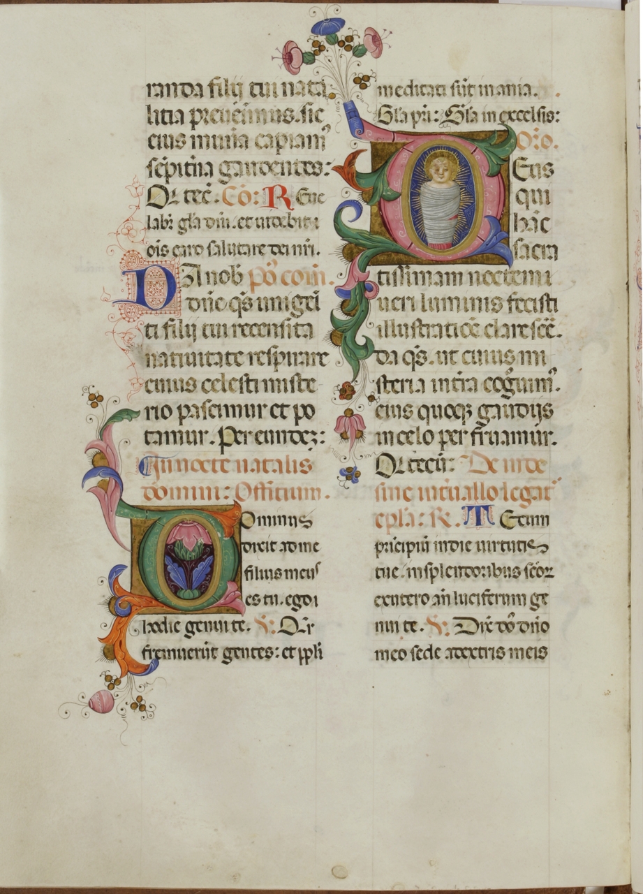 Iniziale fogliata media caudata D (Dominus dixit), rubr. In nocte natalis domini. Offitium. Corpo della lettera verde, fondo nero con un grande fiore dai petali rosa e le foglie azzurre