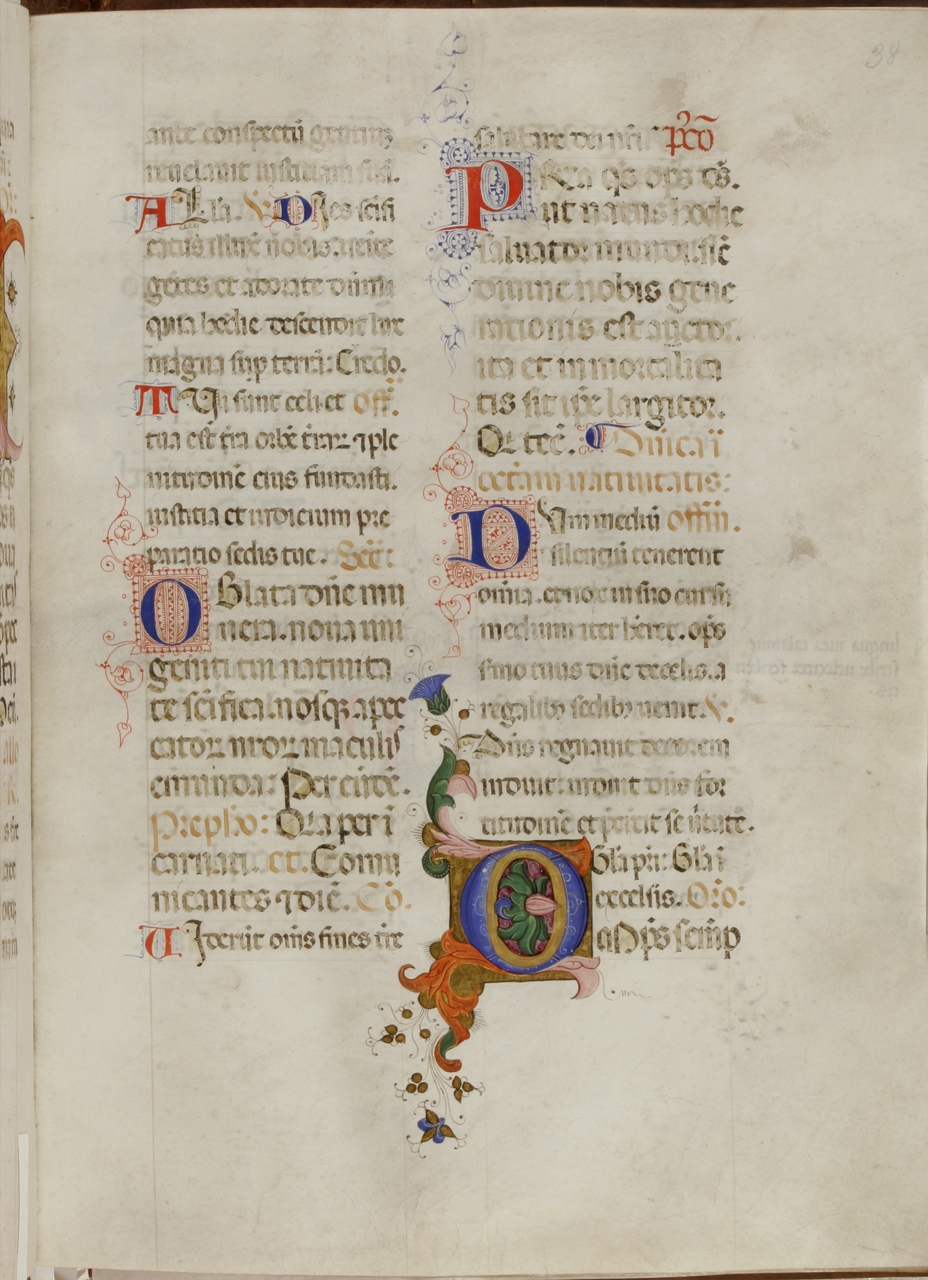 Iniziale fogliata media caudata O (Omnipotens), rubr. Oratio). Corpo della lettera azzurro, fondo viola con un fiore rosa non ancora dischiuso e le foglie verdi