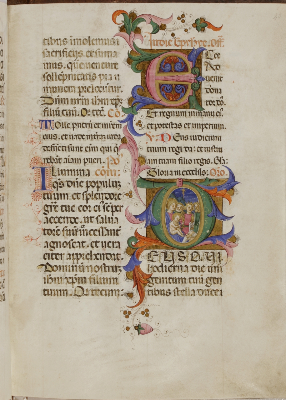 Iniziale fogliata grande caudata E (Ecce advenit), rubr. In die epyphanye. Offitium. Corpo della lettera rosa, fondo viola con foglie arancioni, azzurre e dorate