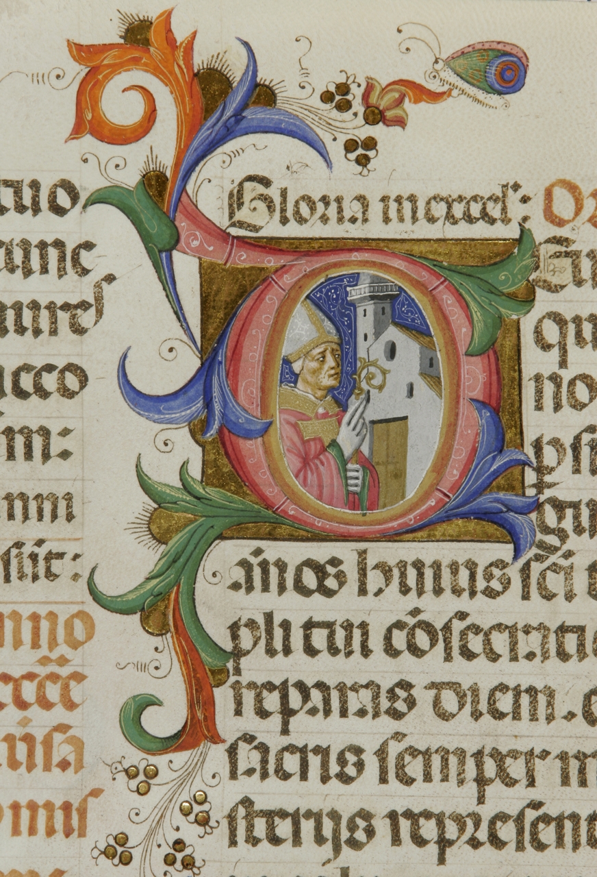 Iniziale fogliata grande con figura e caudata D (Deus qui nobis), rubr. Oratio. Corpo della lettera rosa, fondo azzurro ornato da sottili cirri bianchi: in esso è rappresentato un vescovo con il mantello rossa ornato da strisce dorate decorate con cirri gialli, con i guanti bianchi e il cappello; con le mani tiene un pastorale dorato che termina con un ricciolo goticheggiante. Sullo sfondo è una chiesa fiorentina con il tetto a doppio spiovente, con la facciata bianca e un oculo centrale; il campanile è simile a una torre e il portone è dorato