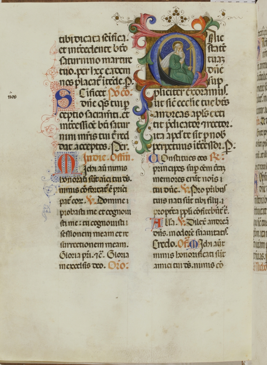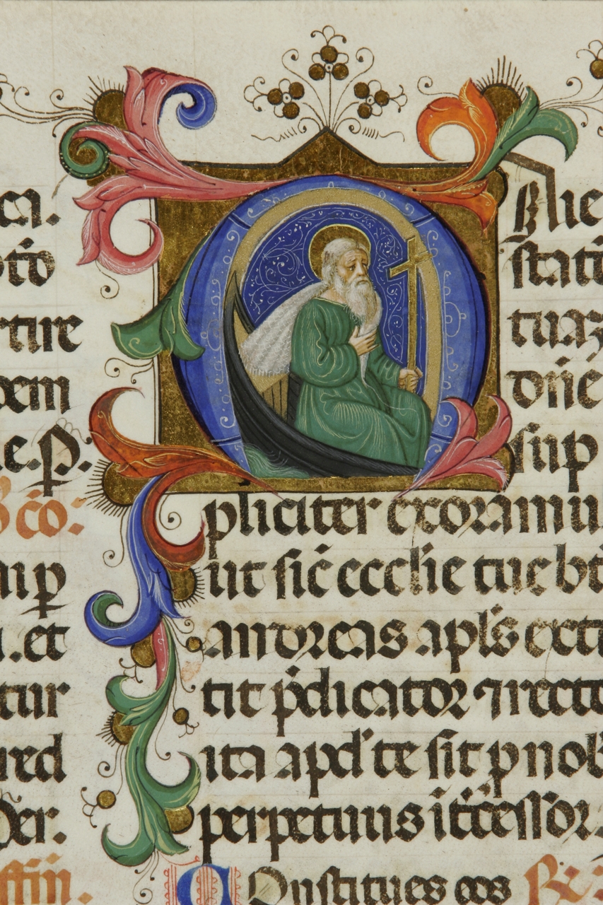 Iniziale fogliata grande con figura e caudata M (Maiestatem tuam), rubr. Oratio. Corpo della lettera azzurro, fondo anch'esso azzurro decorato con finissimi cirri bianchi nel quale è rappresentato l'apostolo Andrea seduto dentro la barca Egli indossa una veste verde, come le onde del mare che si intravedono sotto la barca, e sulla spalla sinistra tiene appoggiata la rete da pesca Con una mano regge la croce, ha una lunga barba e i capelli bianchi e l'aureola dorata