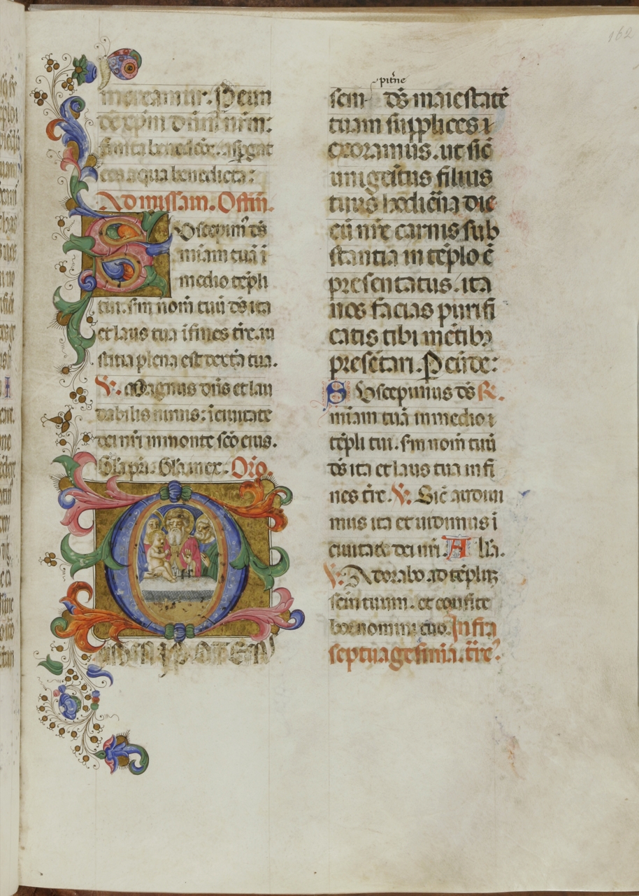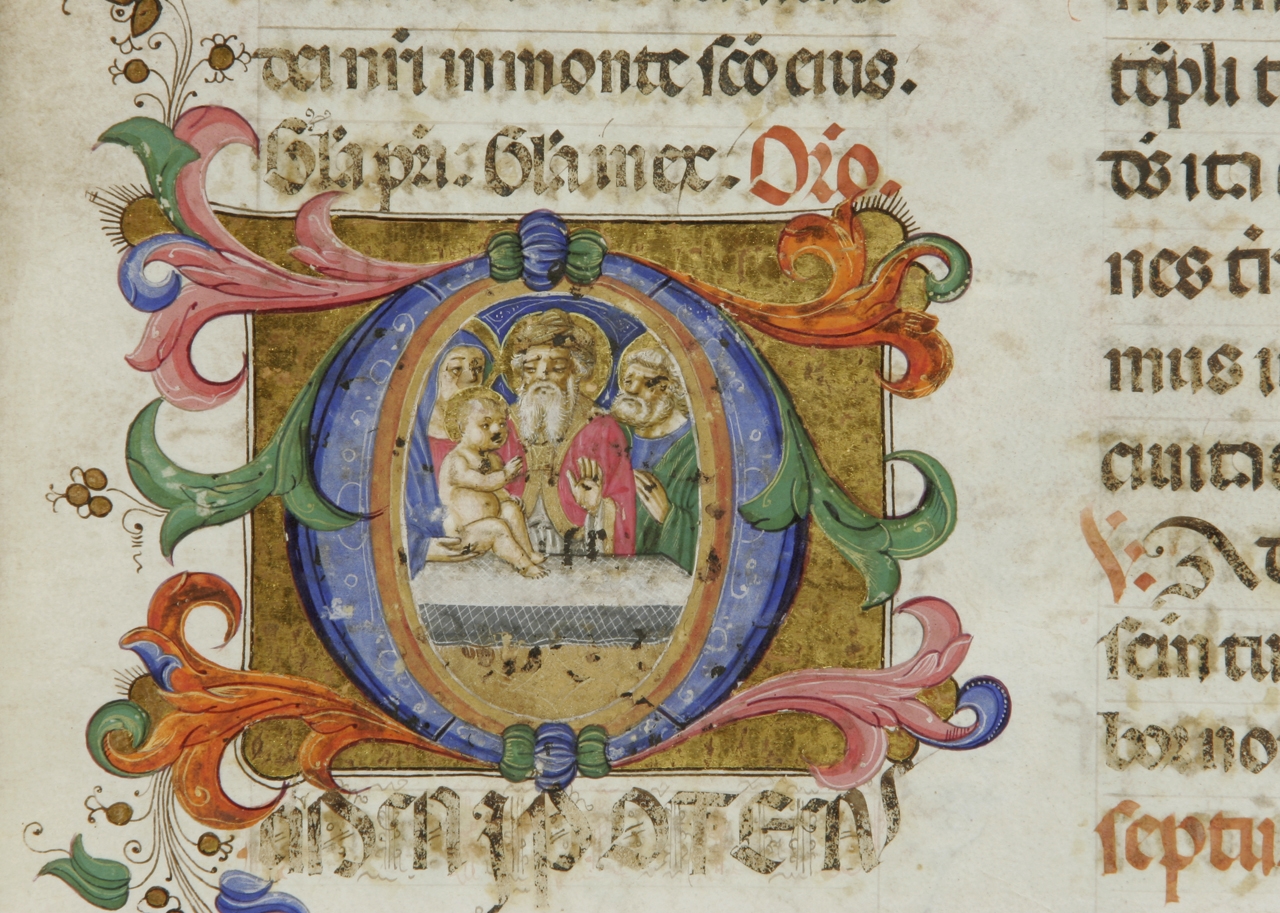 Presentazione di Cristo al tempio O (Omnipotens sempiterne deus), rubr. Orazio. Corpo della lettera azzurro, stretto da alcuni anellini azzurri e verdi, fondo anch'esso azzurro. La scena rappresentata mostra il piccolo Gesù che viene posato dalla Vergine sull'altare, di fronte al sacerdote. Quest'ultimo, che indossa una veste rosa bordata d'oro, un turbante dorato ed ha una lunga barba bianca, accoglie il Bambino con le mani alzate in segno di rispetto. Accanto al sacerdote è anche Giuseppe che indossa un mantello verde. La stoffa che ricopre l'altare è resa con trasparenza e l'altare è dorato. Nella coda sono rappresentati due piccoli fiori azzurri