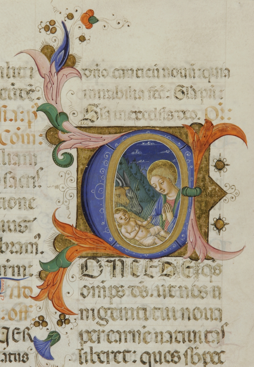 Iniziale fogliata grande con storia e caudata C (Concede quis), rubr. Oratio. Corpo della lettera azzurro, sul fondo è rappresentata la Vergine intenta ad adorare il Bambino disteso sulla mangiatoia e circondato da raggi di luce dorati. In secondo piano sono visibili le teste del bue e dell'asino e, sullo sfondo, due montagne verdi e il cielo punteggiato da sottili nuvolette. La Vergine, con i capelli biondi e il volto rappresentato di tre quarti, indossa una cioppa rossa e un mantello con maniche azzurro foderato di verde