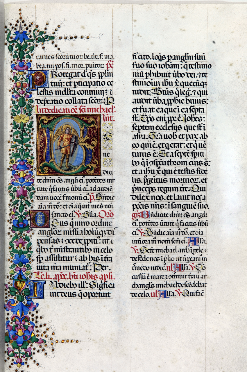 Iniziale fogliata grande con figura e caudata B(enedicite dominum), rubr. In dedicatione sancti Michaelis. Introitus. Corpo della lettera azzurro con decorazioni dorate e fogliacee, campo rosso con racemi dorati; il fregio si estende per tutto il margine interno. Sul fondo è rappresentato l'arcangelo Michele, con le ali dorate, entro una mandorla di luce con i piedi sopra il drago sconfitto; indossa un'armatura rossa e tiene una spada e lo scudo bianco con una croce rossa