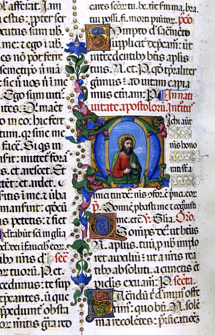 Iniziale fogliata grande con figura e caudata M(ichi autem), rubr. In nativitate apostolorum. Introitus. Corpo della lettera azzurro con decorazioni fogliacee che vanno a formare la coda. Sul fondo è la figura a mezzobusto di un santo apostolo con lunghi capelli e barba scuri