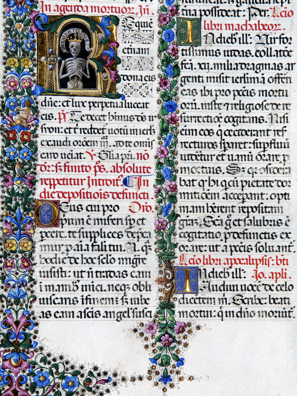 Iniziale fogliata grande con figura e caudata R(equiem eternam), rubr. In agenda mortuorum. Introitus. Corpo della lettera nero con gioielli con perle, decorazioni geometriche dorate e fogliacee; fregio che si estende su tutto il margine interno della pagina e tra le due colonne di scrittura fino a formare composizioni floreali nei margini superiore e inferiore. Sul fondo è rappresentato uno scheletro con le mani giunte e la corona in testa; sopra di lui si srotola un cartiglio