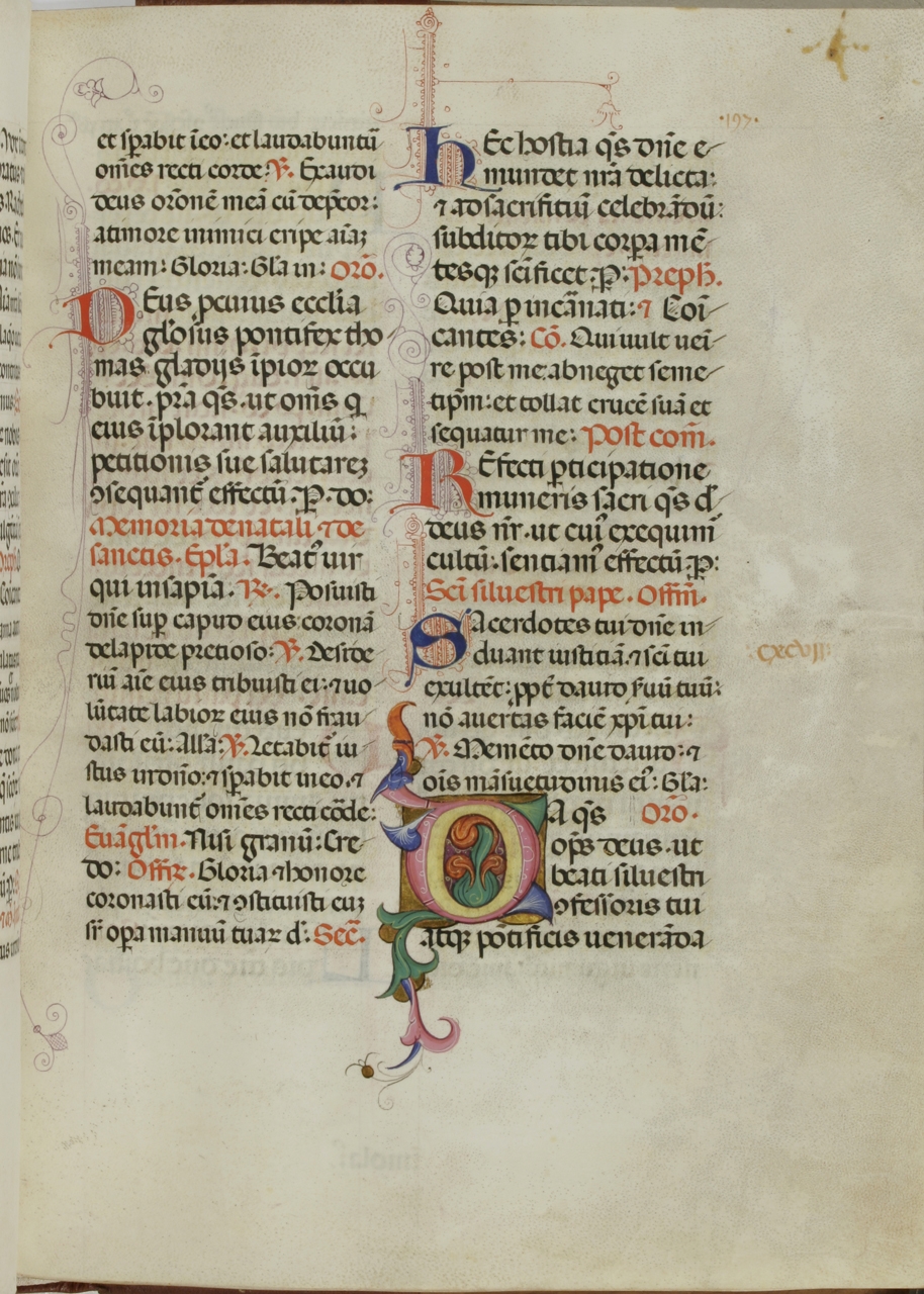 Da quis (rubr., Oratio. Rubr. sup., Sancti Silvestri pape. Offitium). Iniziale fogliata piccola caudata
