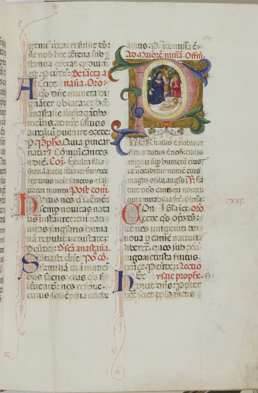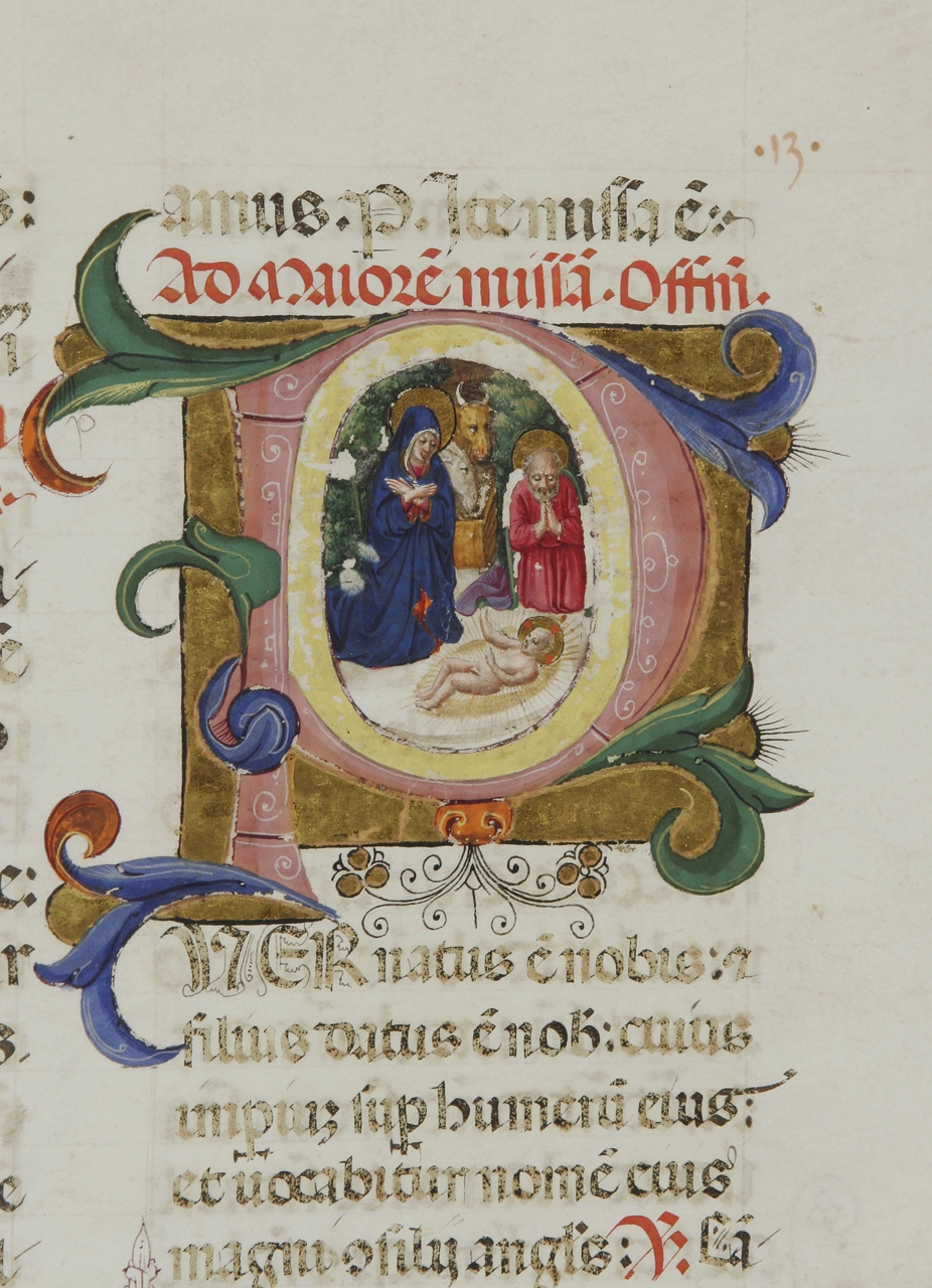 Iniziale fogliata grande con storia e caudata P(uer natus est), rubr. Ad maiorem missam. Offitium. La scena sul fondo della lettera sembra ambientata in un esterno per la presenza di due cespugli sullo sfondo. Il Bambino giace in terra, circondato da raggi di luce, mentre viene adorato dalla Vergine, che si porta le mani al petto, e san Giuseppe con le mani giunte. In secondo piano si scorgono le teste del bue e dell'asino mentre mangiano il fieno nella mangiatoia