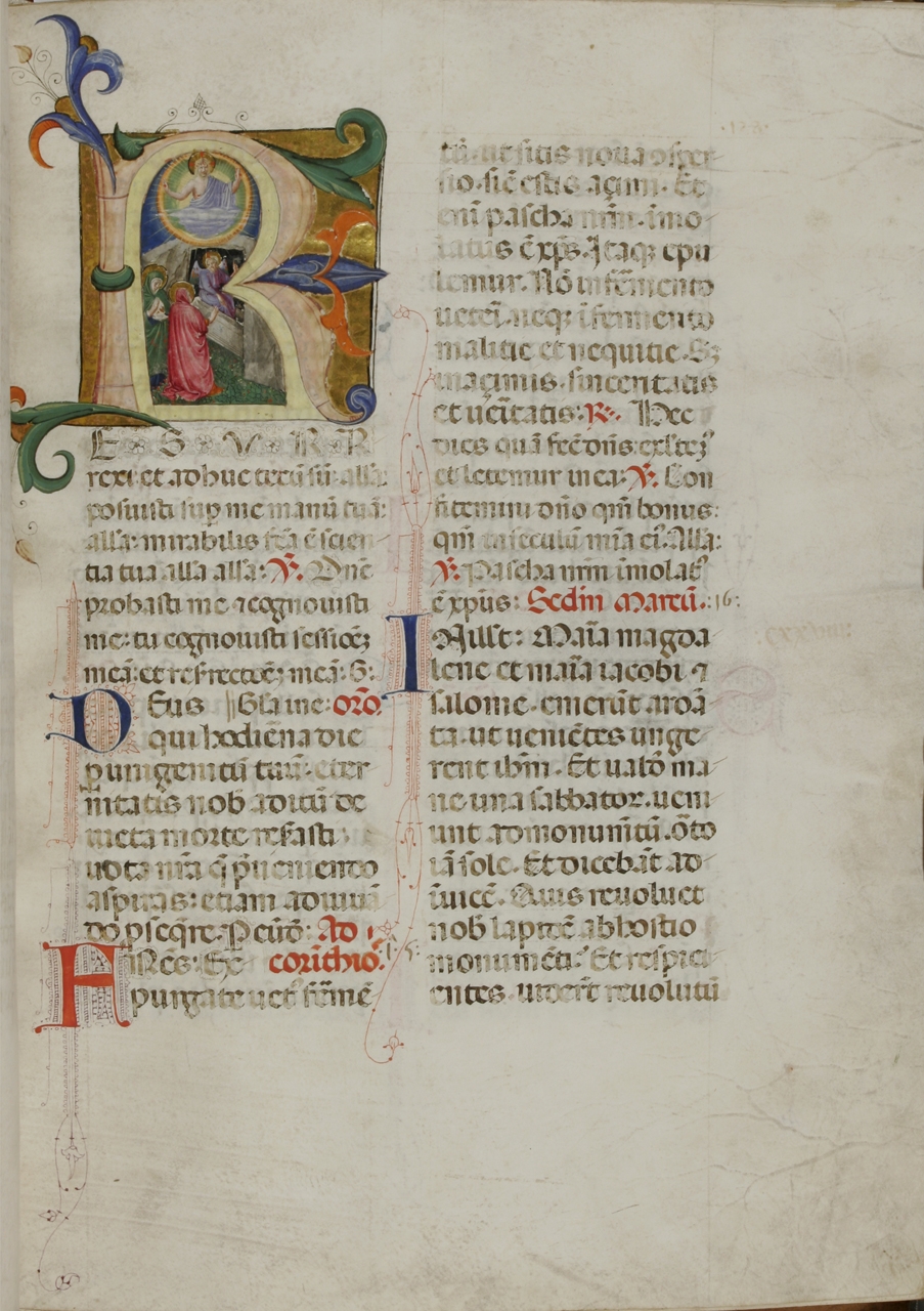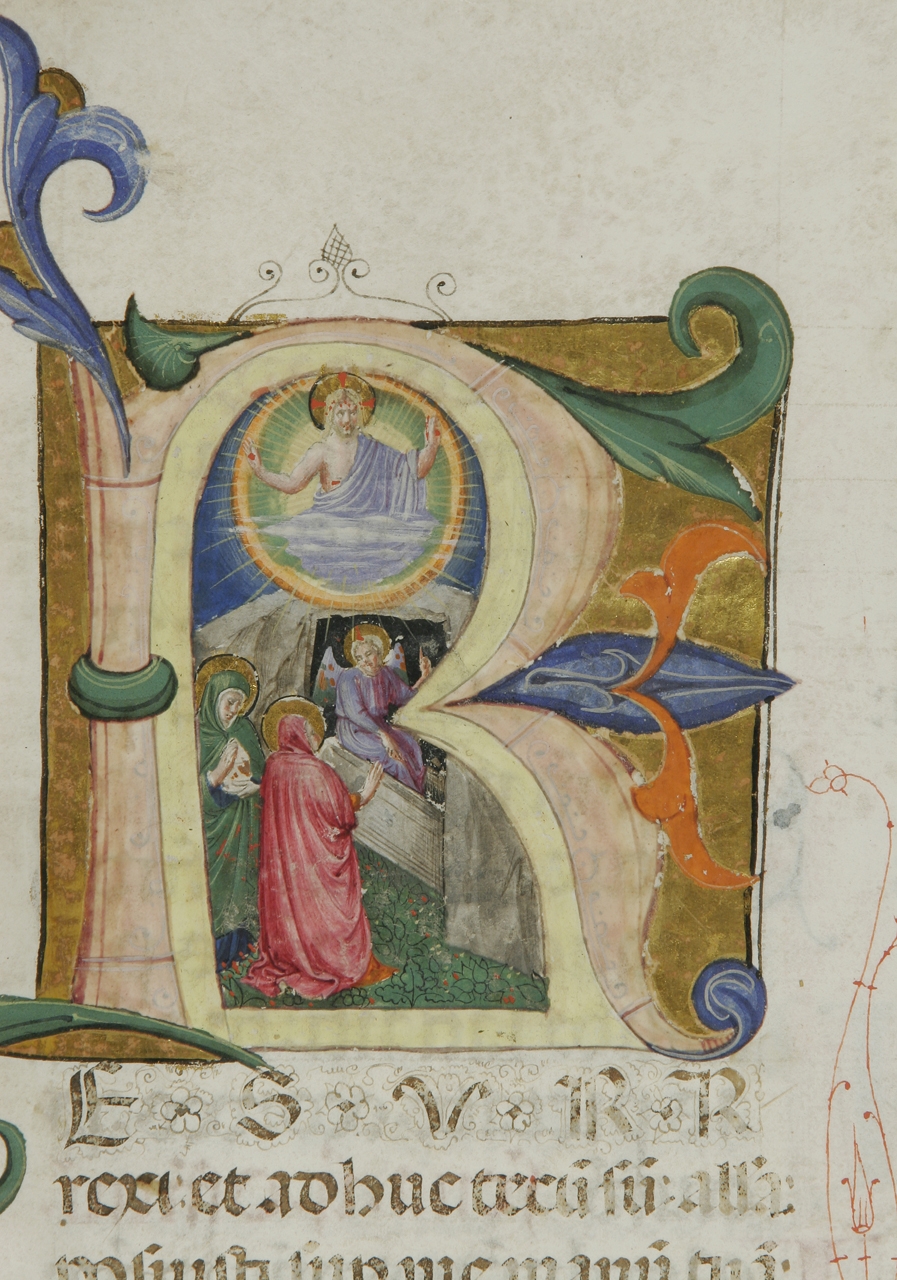 Iniziale fogliata grande con storia e caudata R(esurrexi et adhuc tecum sum). Il corpo della lettera è di un delicato colore rosa avorio e il fondo è incorniciato da un bordo giallo. Nella scena rappresentata sono condensati due momenti diversi degli episodi evangelici infatti, nell'occhiello superiore è la figura a mezzobusto di Cristo risorto che si erge dalle nuvole ed è circondato da raggi di luce e da una mandorla circolare con cerchi concentrici di vari colori. Nello spazio sottostante sono rappresentate due delle Marie che si recarono al sepolcro che è, infatti, scoperchiato e al posto di Cristo c'è l'angelo seduto ad annunciare che Gesù è risorto. Il sepolcro è in un paesaggio roccioso ma il suolo è ricoperto da un prato pieno di piantine con bacche rosse; la Maria con il mantello verde tiene in mano un vasetto, forse contenente l'olio per i defunti
