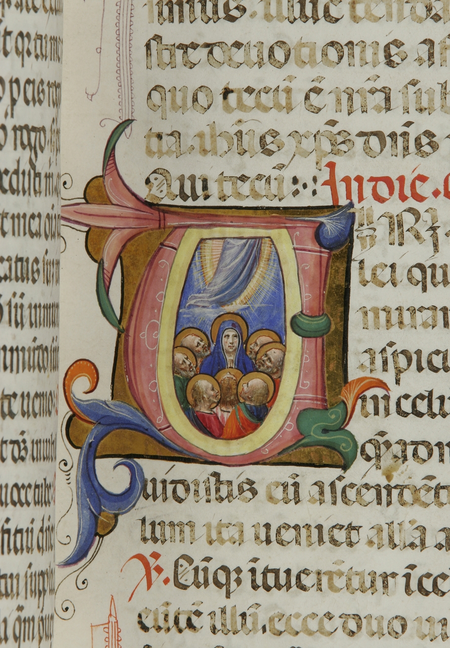 Iniziale fogliata grande con storia e caudata V(iri Galilei), rubr. In die. Offitium. Sul fondo della lettera sono le figure, visibili solo per la testa, di alcuni apostoli che circondano la Vergine che emerge dal centro coperta dal mantello azzurro; lo sguardo degli apostoli è rivolto verso l'alto dove è rappresentata una parte della tunica di Cristo che sta ascendendo al cielo circondato da una mandorla di luce colorata