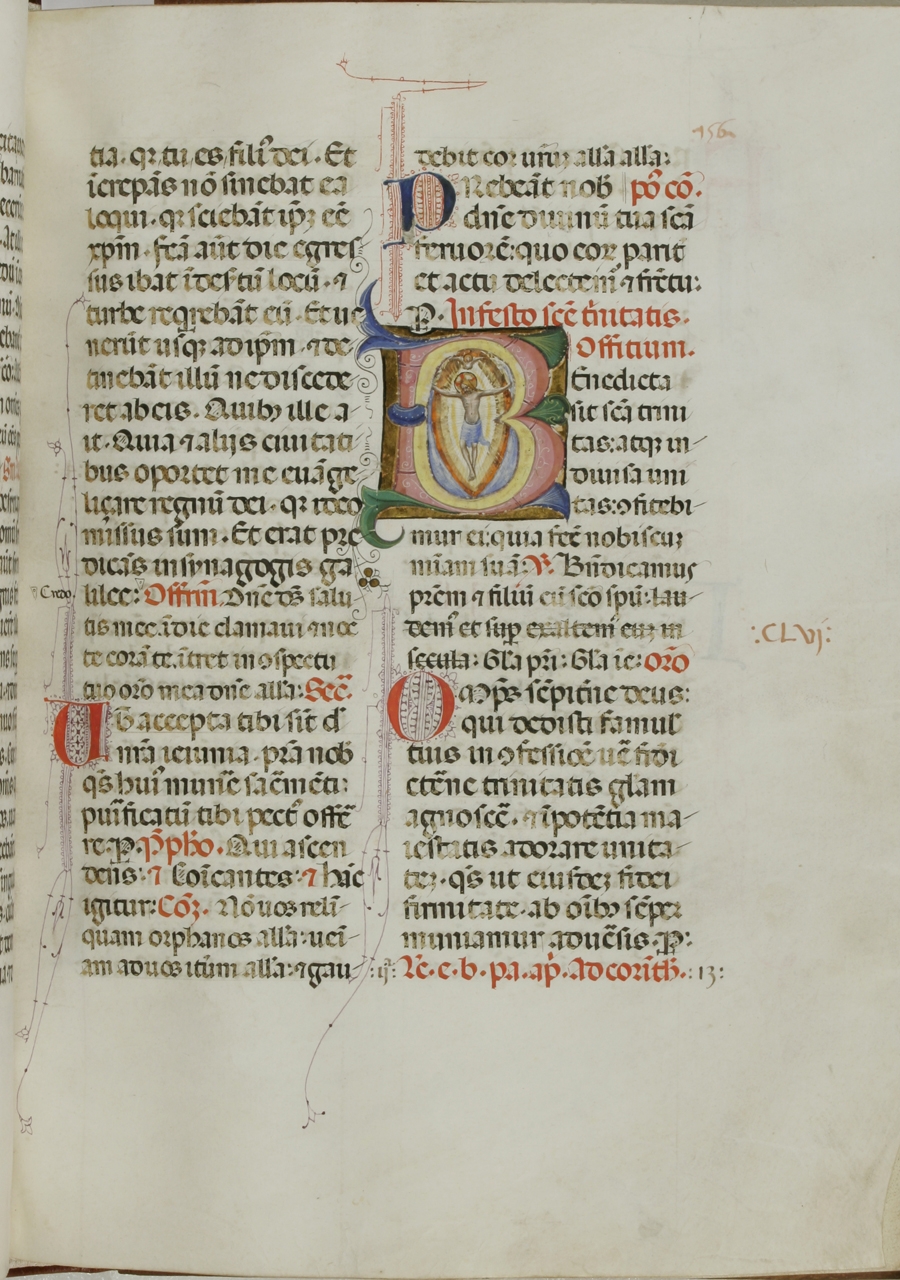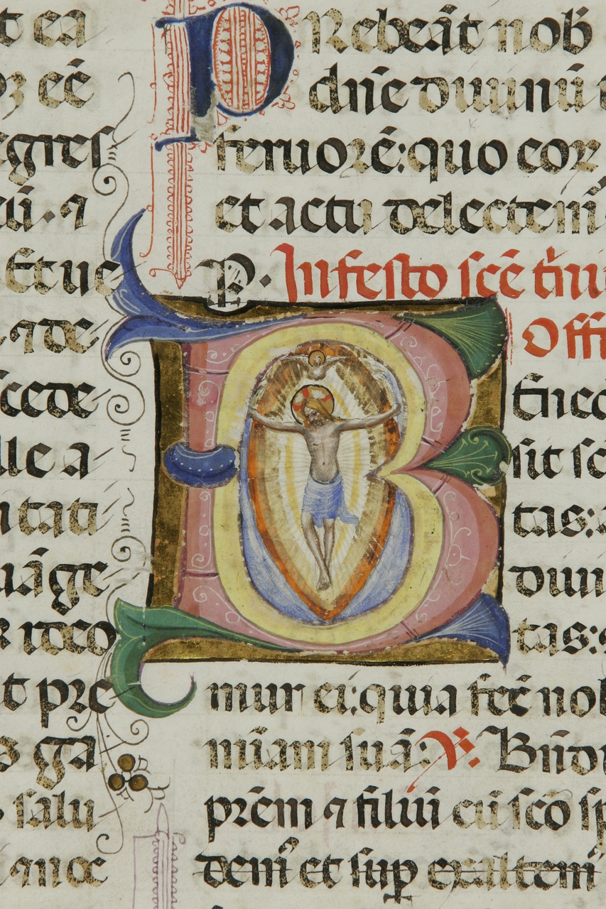 Iniziale fogliata grande con figure e caudata B(enedicta sit sancta trinitas), rubr. In festo sancte trinitatis. Offitium. Il fondo della lettera è interamente occupato dalla mandorla di luce al centro della quale è la figura di Cristo crocefisso - ma senza la croce - sopra il quale è la colomba dello Spirito Santo. È assente l'immagine di Dio Padre a causa delle piccole dimensioni della lettera, forse simboleggiato dalla sola mandorla di luce