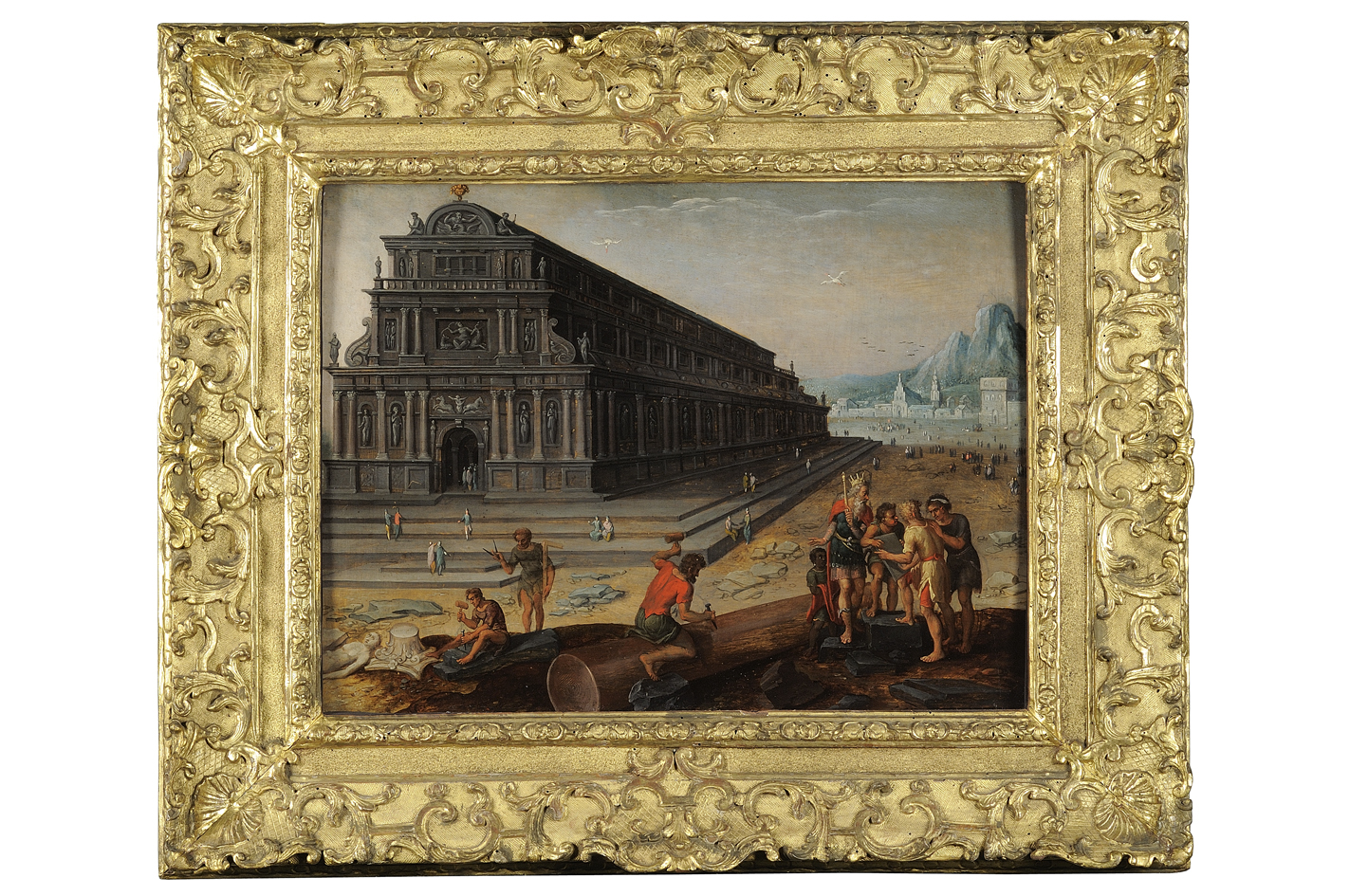 - NOTIZIE STORICO CRITICHE Le sette tavolette, rese note in anni recenti da Serena Padovani (1989), alla quale è dovuta l'attribuzione al pittore fiammingo Bernard Rantwyck, riflettono fedelmente la serie incisa nel 1572 da Philip Galle su disegno di Maarten van Heemskerck, che ebbe subito notevole successo. Alla serie fiorentina manca soltanto la tavoletta con il Faro di Alessandria, forse ancora non riconosciuta ma più probabilmente andata perduta. Nella tavoletta in oggetto è rappresentato un ricchissimo edificio che ha l'aspetto di un'ideale basilica rinascimentale; in primo piano discute con l'architetto il re Creso, che secondo la leggenda avrebbe donato al tempio le colonne, una delle quali viene lavorata da un personaggio forse identificabile con Skopas. La data apposta sulla Porta di Seramide (inv. 1890 5973; NCT 09-00646240) nel punto in cui nell'incisione si legge la data 1572 dà un riferimento essenziale per la ricostruzione dell'attività del pittore fiammingo, attivo a Siena negli ultimi trent'anni del Cinquecento, e per l'individuazione del momento in cui questi lavorava per i Medici