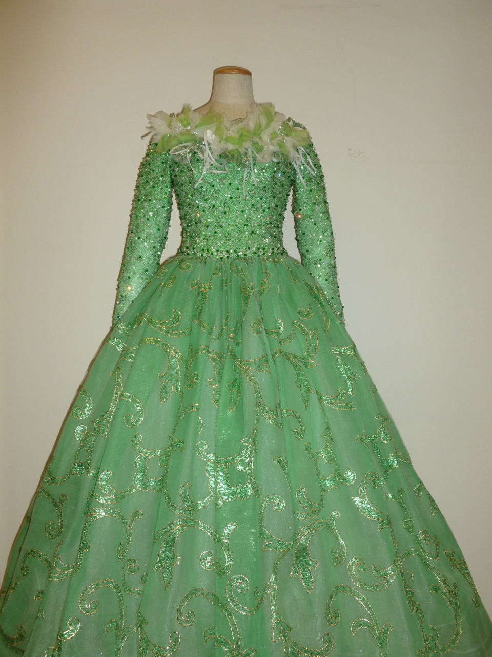Abito da sera tagliato in vita, con corpetto in crêpeline di seta verde chiaro, interamente ricoperto da ricamo in paillettes verdi, perline di plastica sfaccettate di varia grandezza verdi e bianche, strass, cannucce di plastica verde scuro, e ampia gonna a ruota in organza di seta, doppiata di tulle sintetico, con ricamo a tralci floreali stilizzati in filato di lurex verde e oro. Corpetto con ampio scollo rotondo e lieve punta sul retro, profilato anteriormente da guarnizione di fiori in organza verde e bianca, pistilli in materiale plastico madreperlato e arabeschi in filato di lurex analoghi al ricamo della gonna. Maniche lunghe e aderenti, chiuse ai polsi da zip; bustino in raso di seta color avorio steccato e cucito interna mente al corpetto, fodera in crêpeline di seta avorio, chiusura posteriore con zip e gancetti metallici. Ampia sottogonna in più strati di tulle sintetico bianco, fodera della gonna in raso di seta avorio