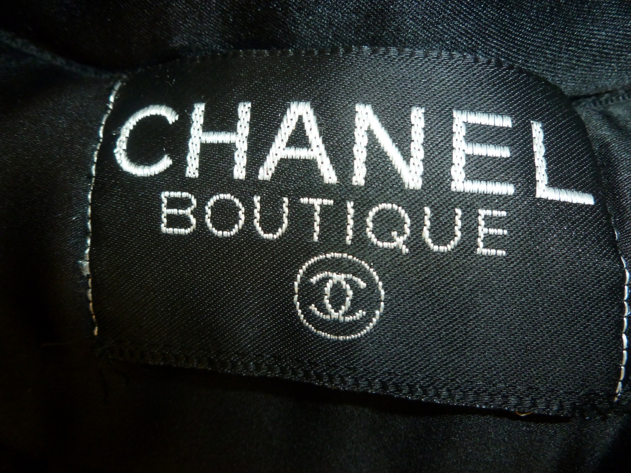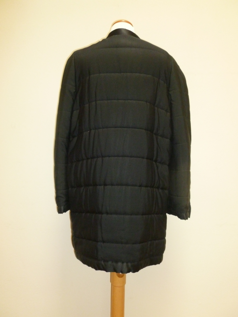 Giubbotto corto di linea dritta, in rayon imbottito di colore nero, con quattro tasche anteriori, due appena sotto l'altezza del seno e due sui fianchi, profilate, come l'apertura centrale e i polsi, da raso di seta nero. Maniche lunghe e dritte, aperte ai polsi da quattro bottoni a pressione in metallo dorato con motivo a intreccio e logo Chanel, identici ai nove posti lungo l'apertura centrale. Fodera in raso di seta di colore nero