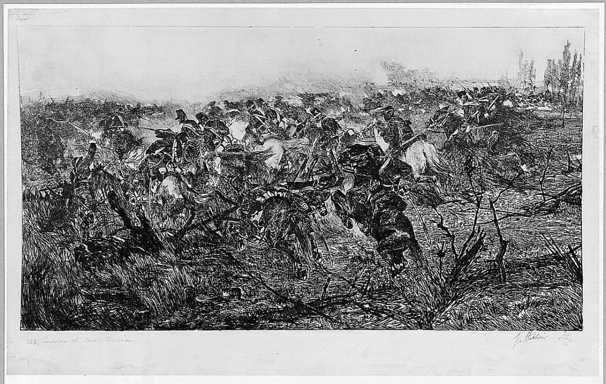 Paesaggi: campo. Figure: soldati. Armi. Animali: cavalli