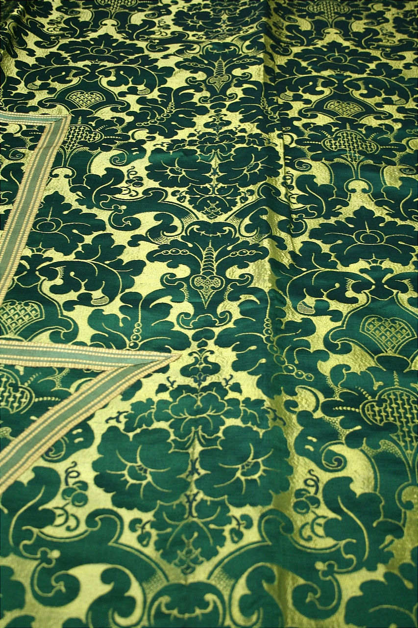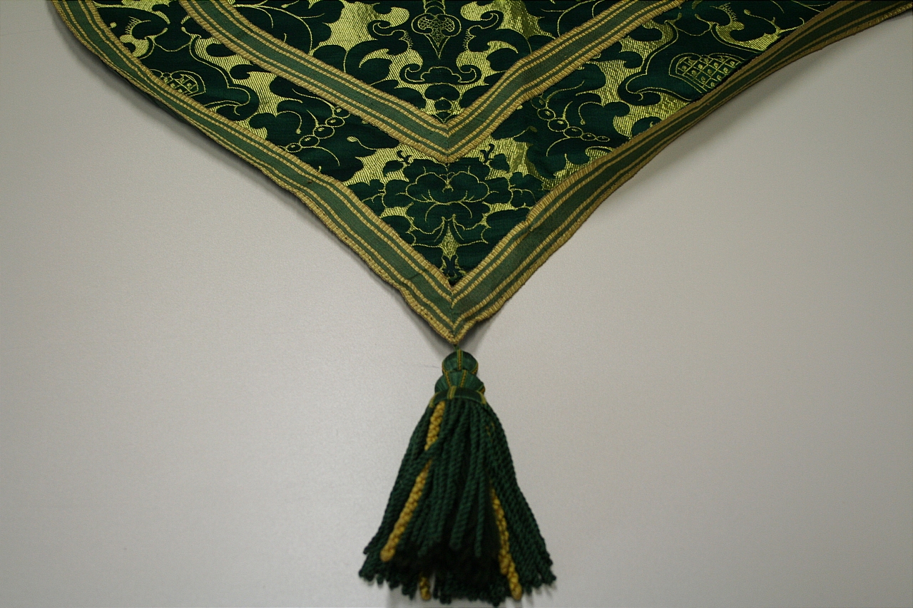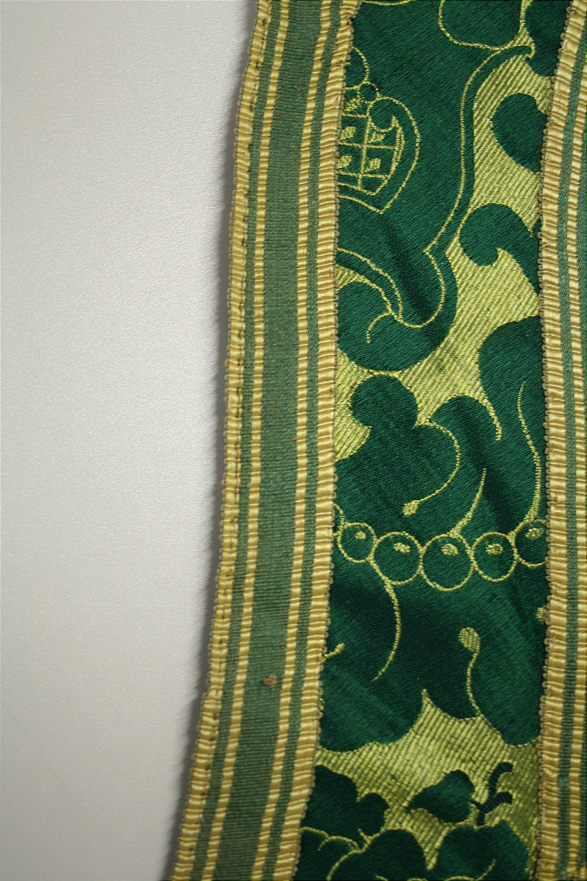 Pendone in broccatello di seta, fondo giallo e opera in verde. Fodera in tela di lino cerato, verde scuro. Bordura in tessuto operato color giallo e verde. Nappa con struttura in legno rivestita in seta e lana color verde e gialla. Misure