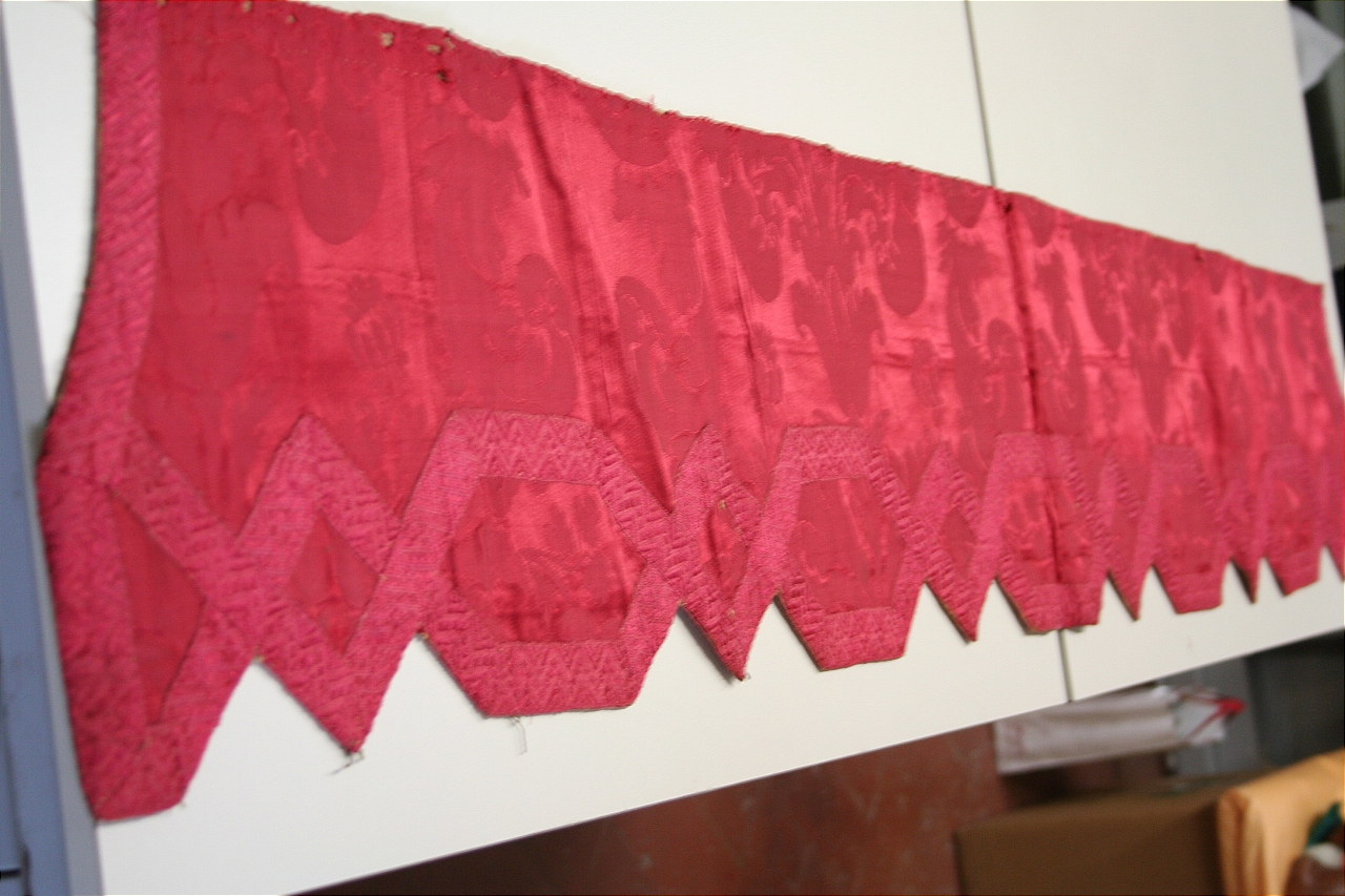 Sopratenda in damasco di seta, fondo raso color cremisi, fodera in tela di lino cerata color rosa. Bordura in tessuto operato color cremisi