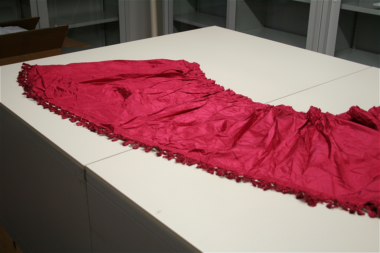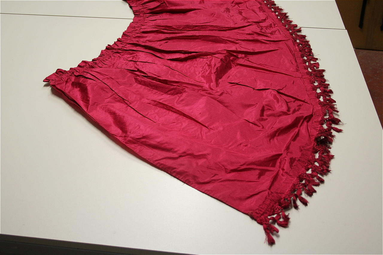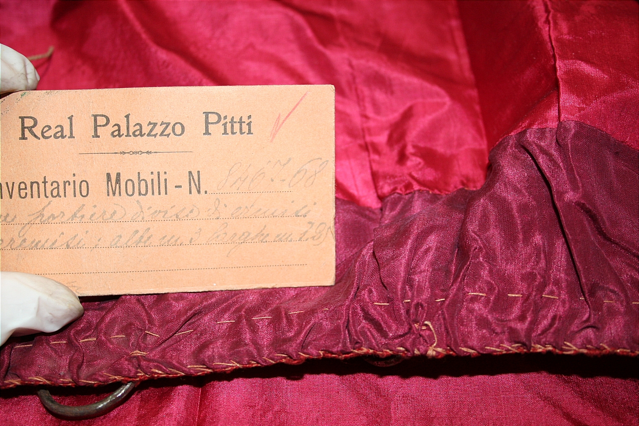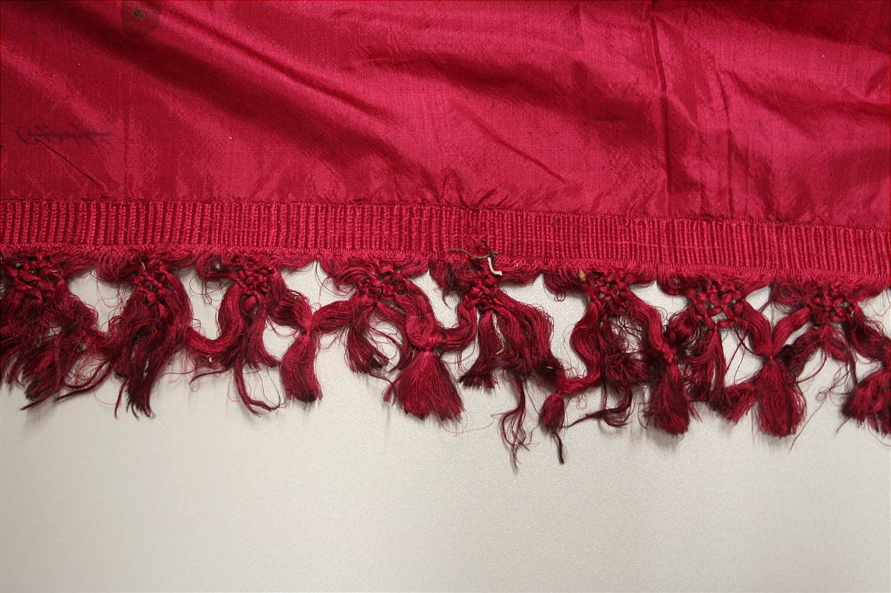 Cortinaggio composto da due portiere divise e due pendoni in taffetas color cremisi. Frangia in seta annodata