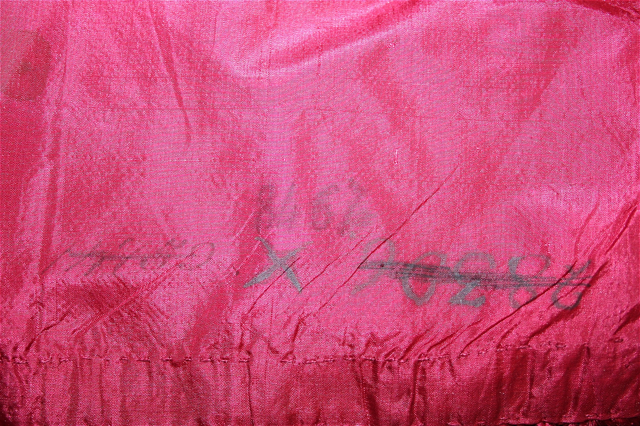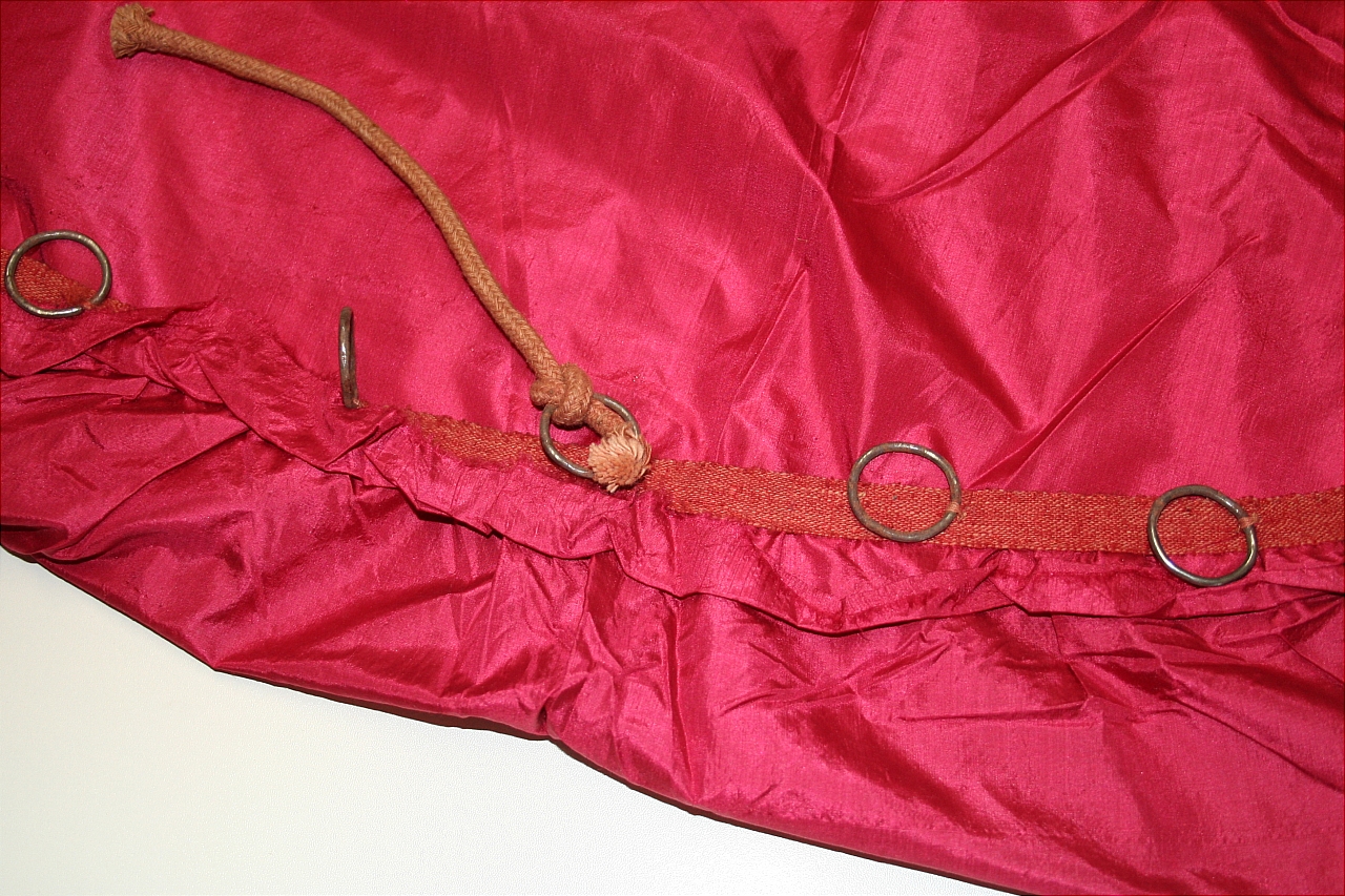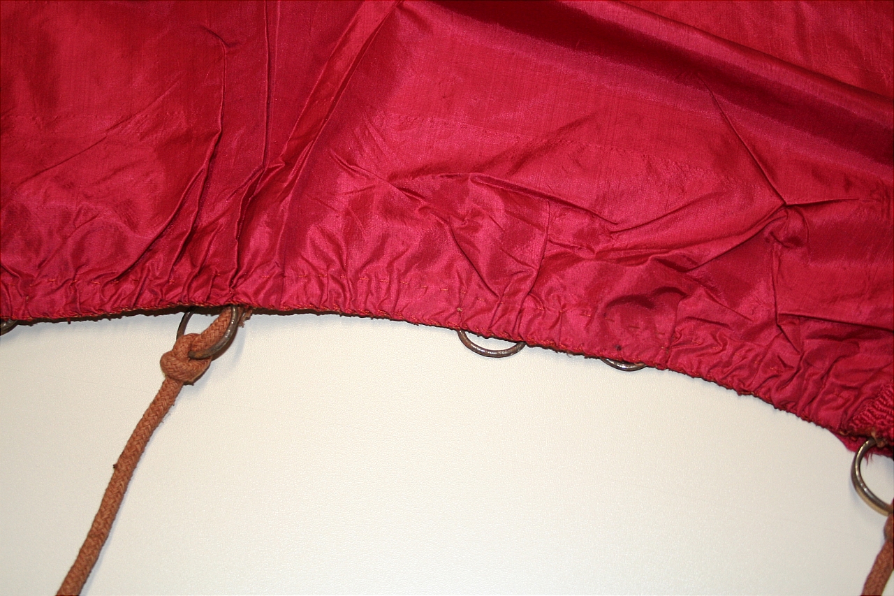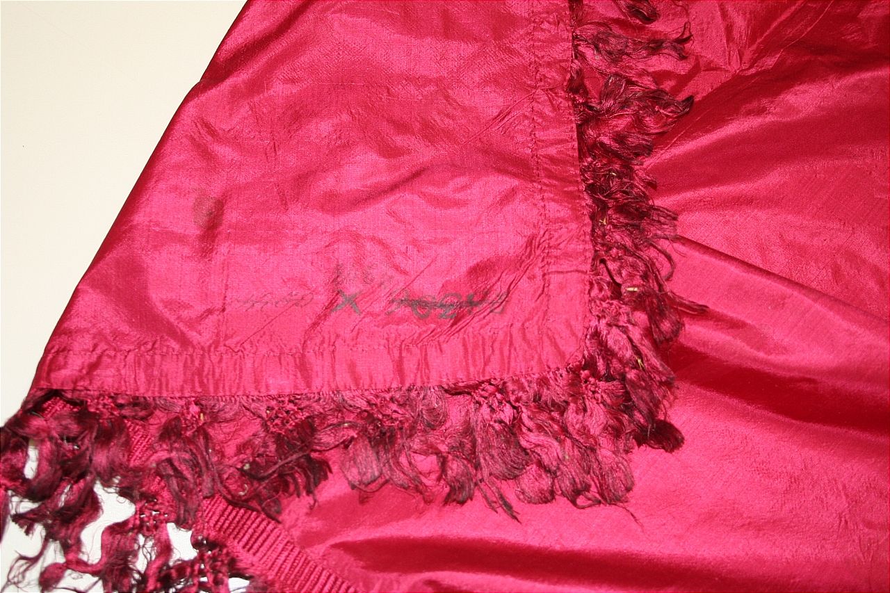 Cortinaggio composto da due portiere divise e due pendoni in taffetas color cremisi. Frangia in seta annodata
