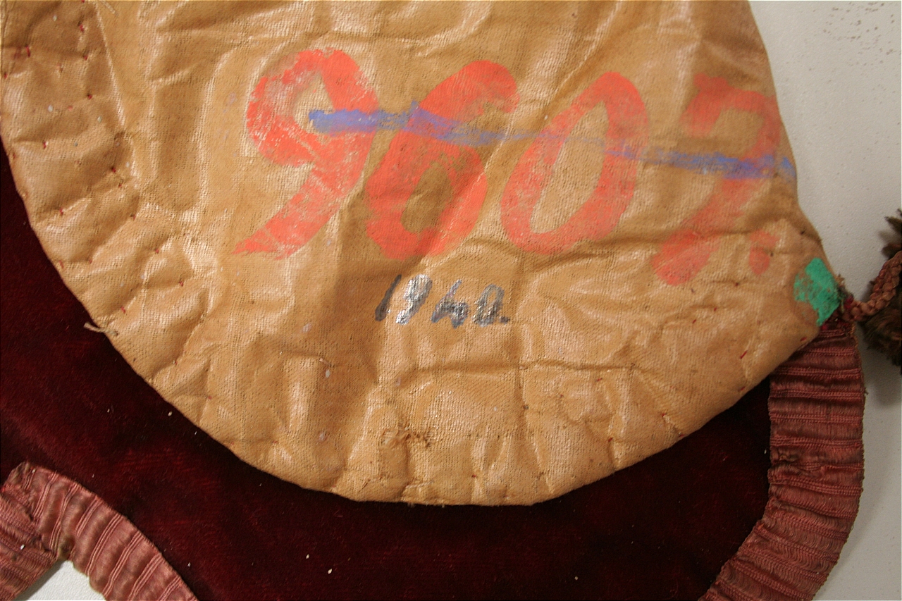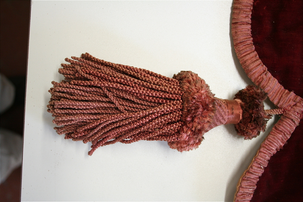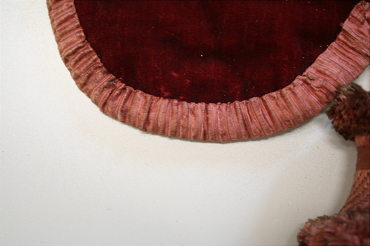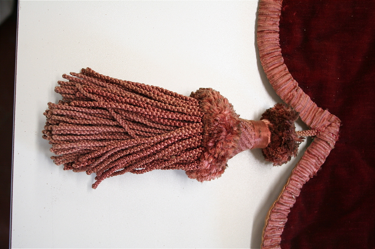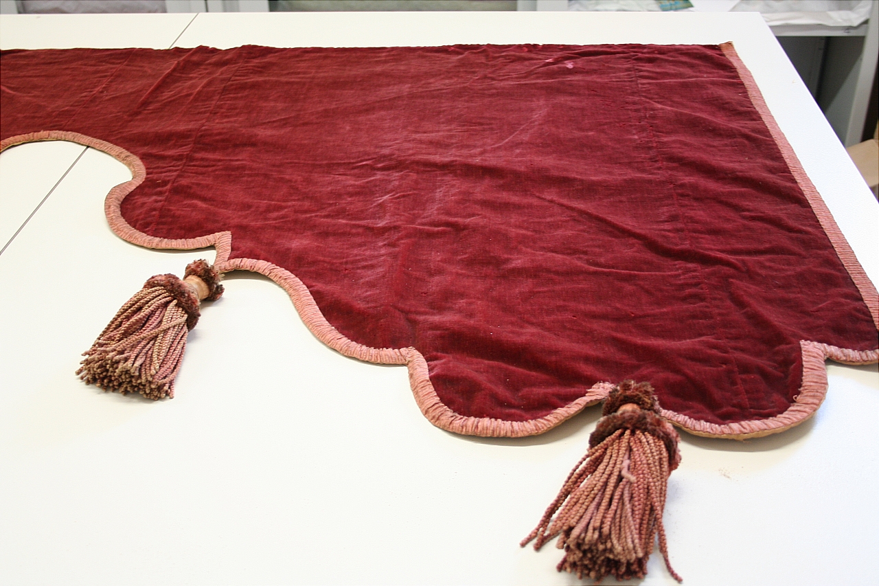 Due pendoni in velluto tagliato di lana color cremisi. Supporto interno in carta. Fodera in tela di cotone cerato, rosa carne. Bordura in tessuto operato in seta, color rosa salmone