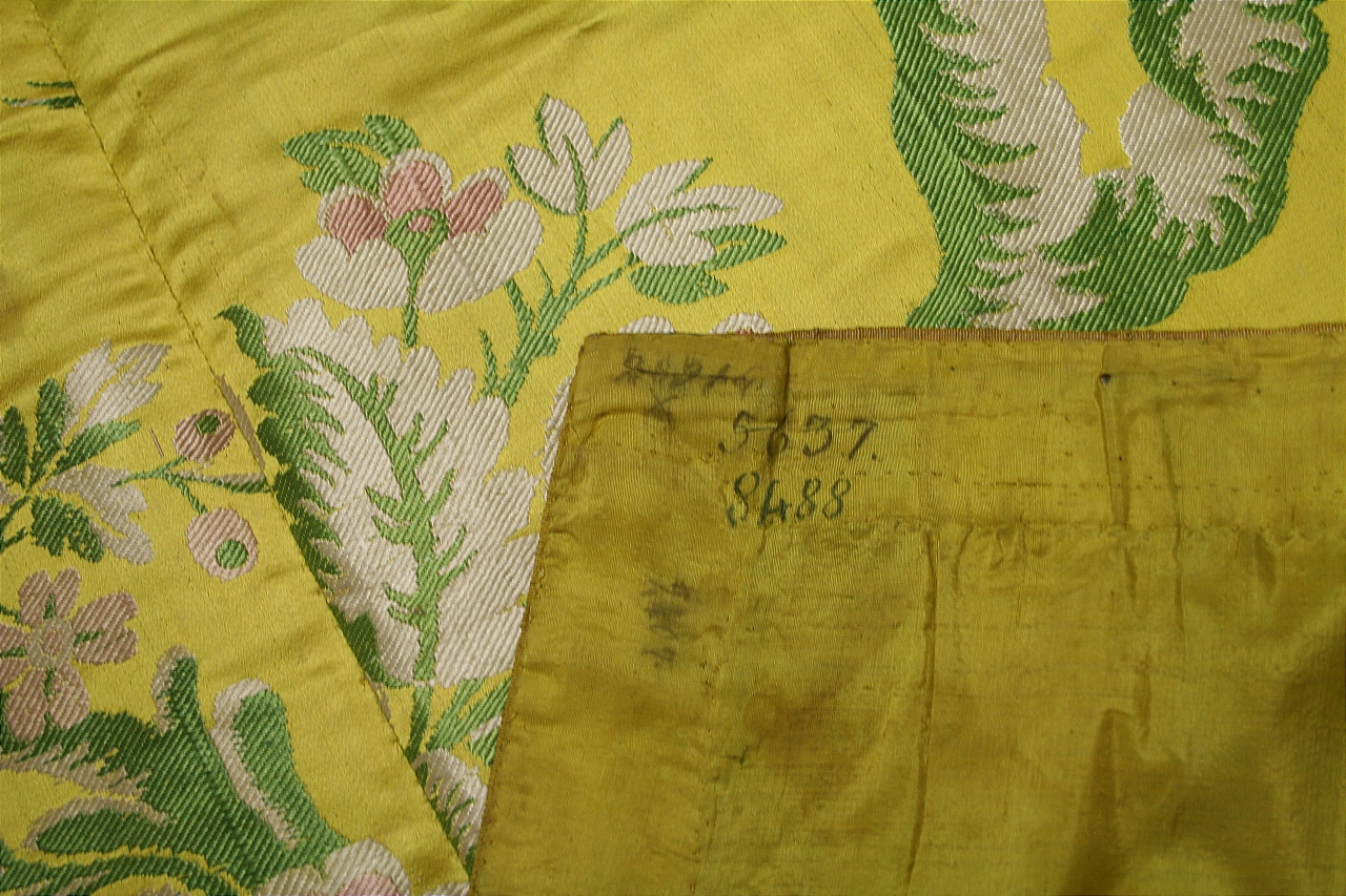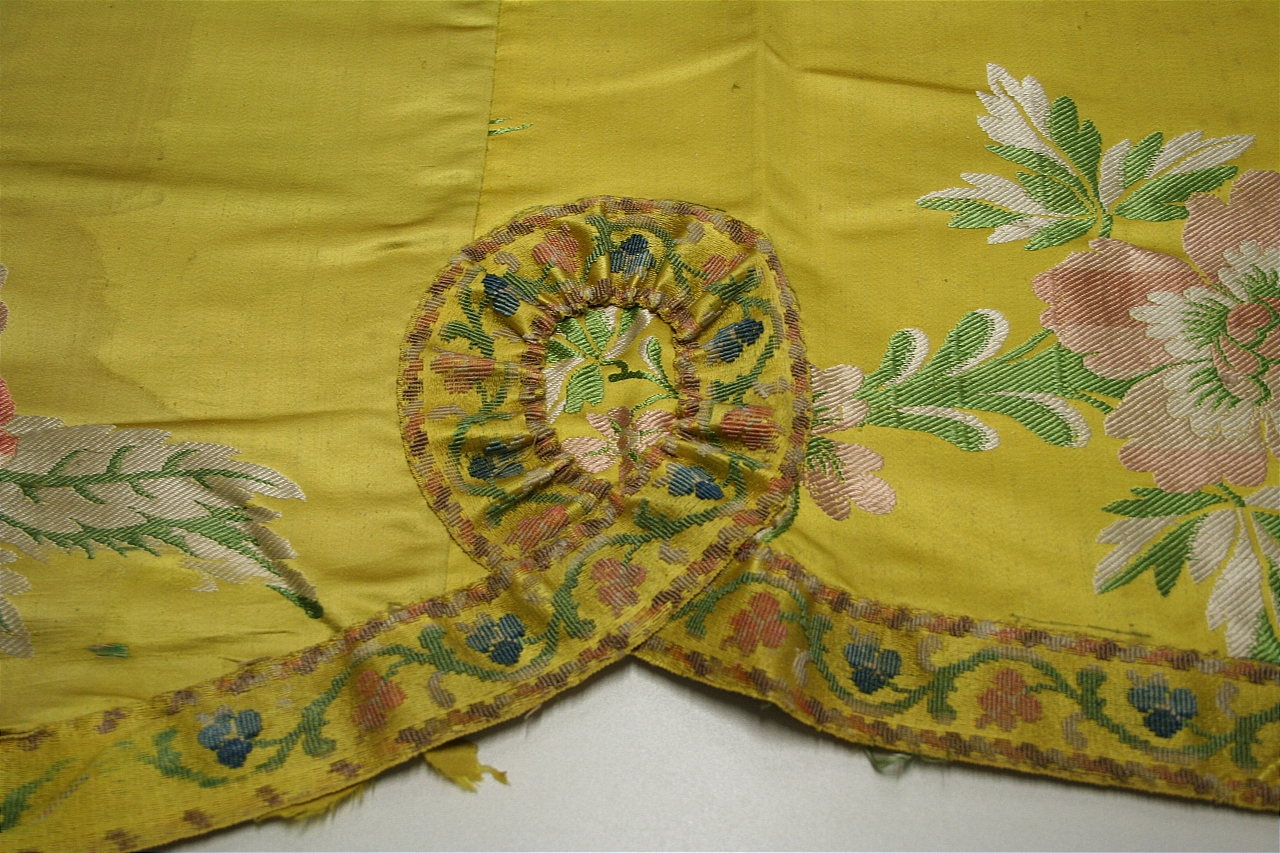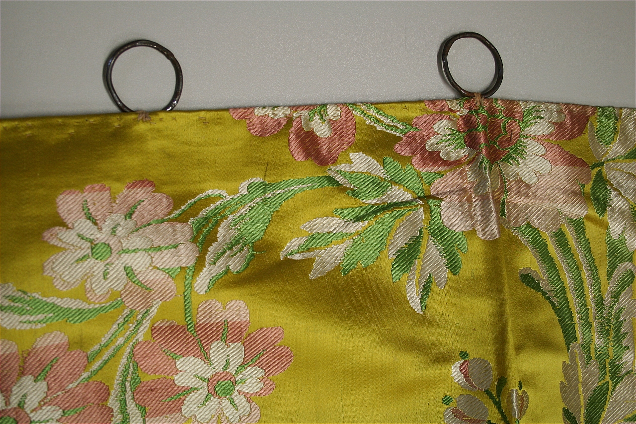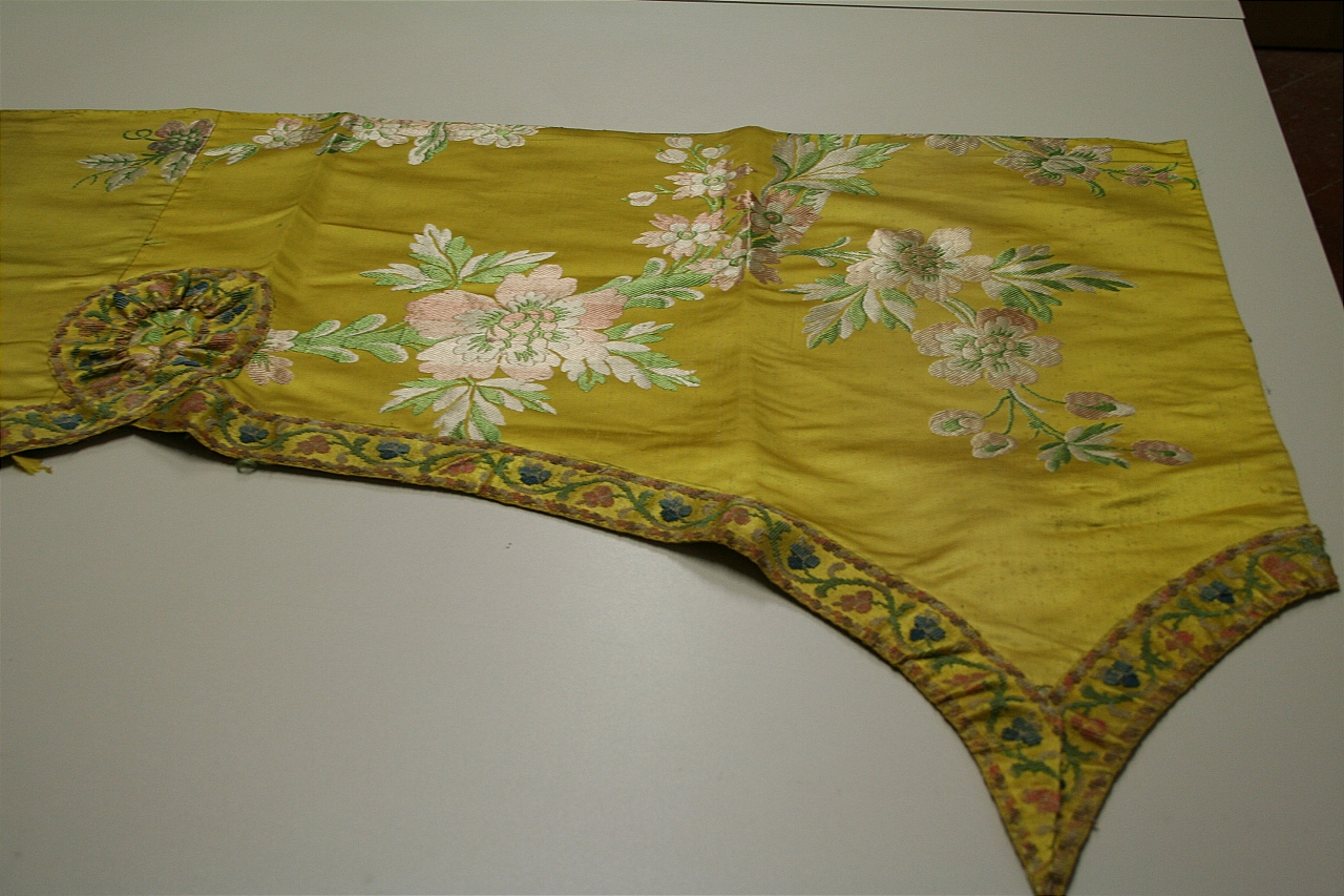 Cortinaggio composto da 6 portiere e 3 pendoni in tessuto operato di seta fondo in raso giallo, opera in seta policroma. Bordura in tessuto operato di seta, fondo in raso giallo opera in velluto riccio in seta policroma. Due portiere presentano una balza in gros de Tours color giallo