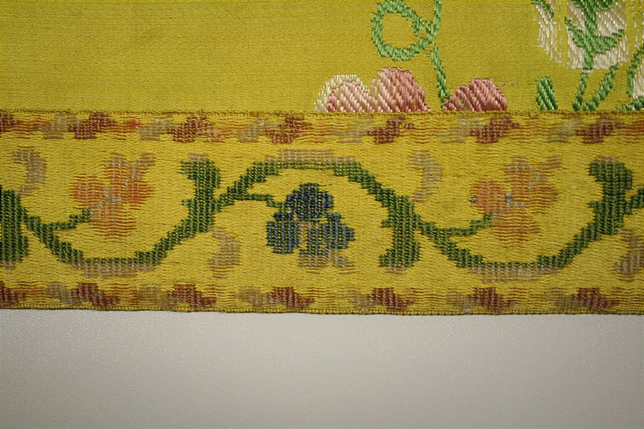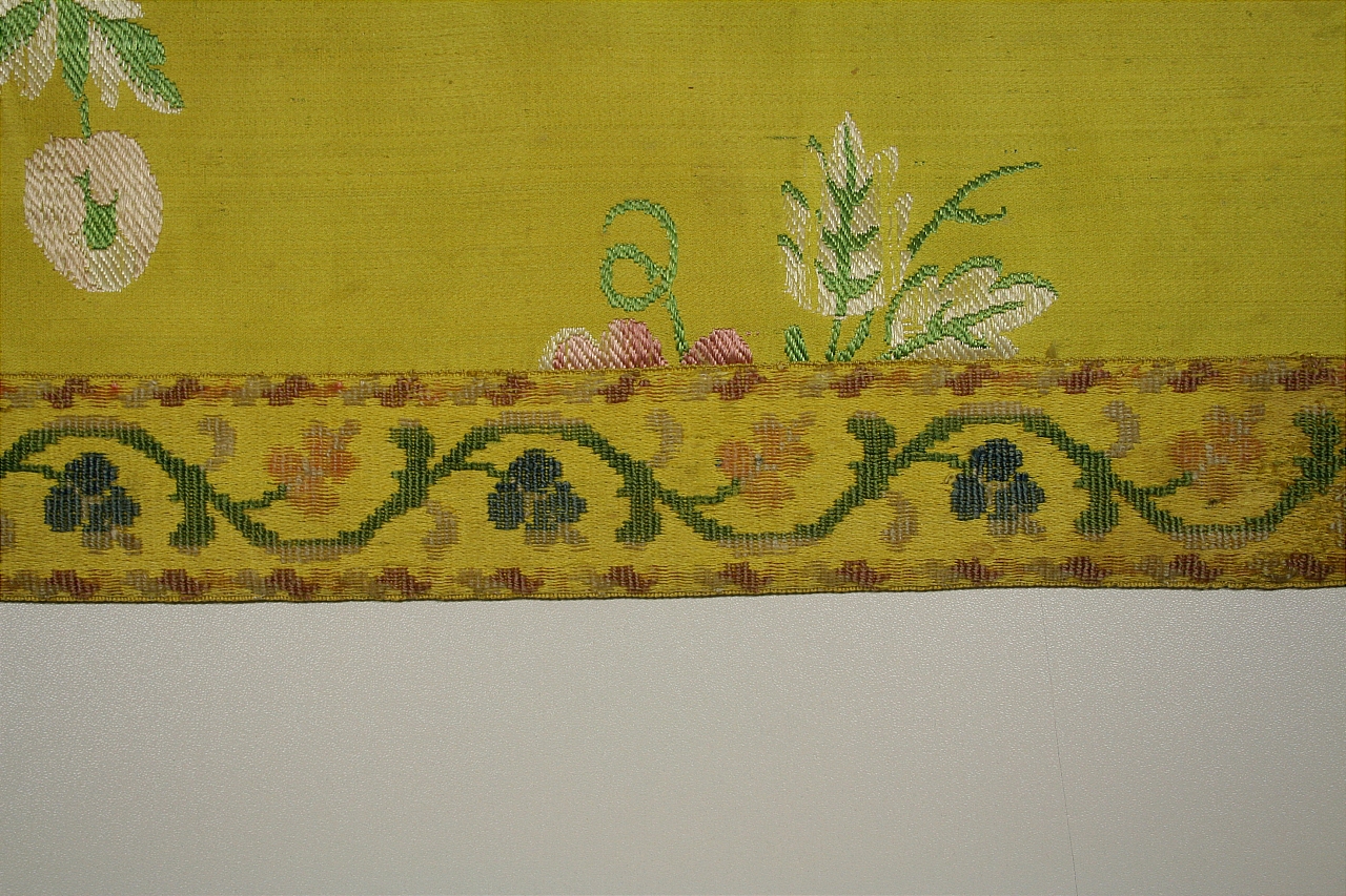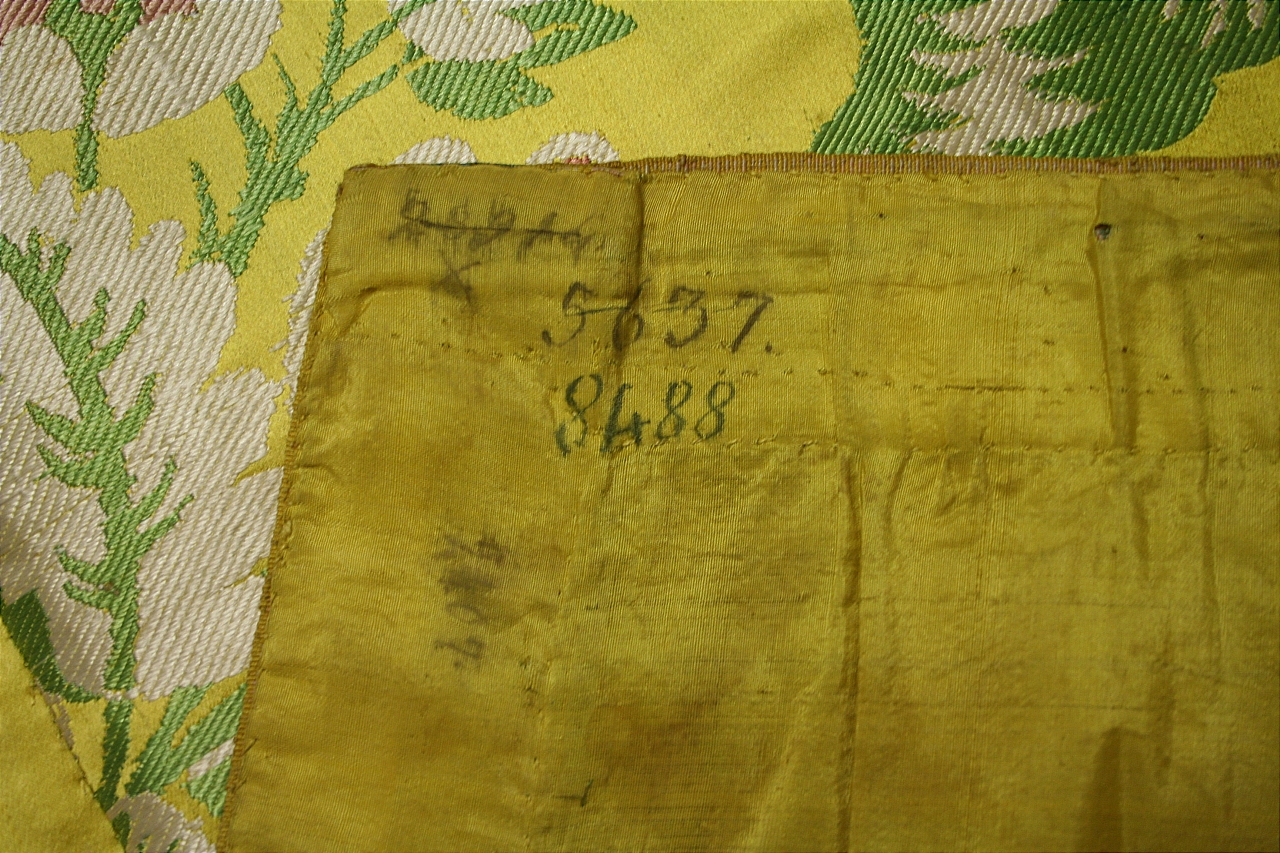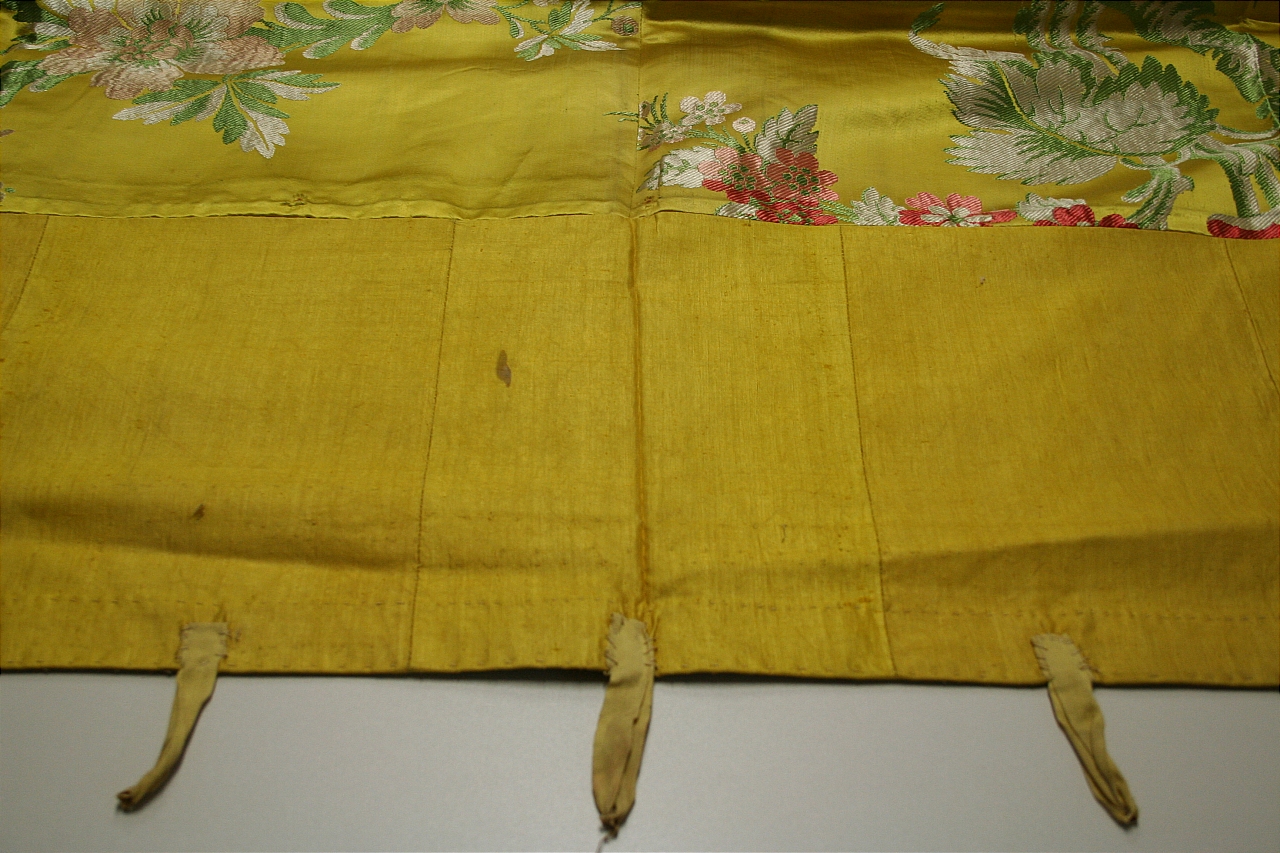 Cortinaggio composto da 6 portiere e 3 pendoni in tessuto operato di seta fondo in raso giallo, opera in seta policroma. Bordura in tessuto operato di seta, fondo in raso giallo opera in velluto riccio in seta policroma. Due portiere presentano una balza in gros de Tours color giallo