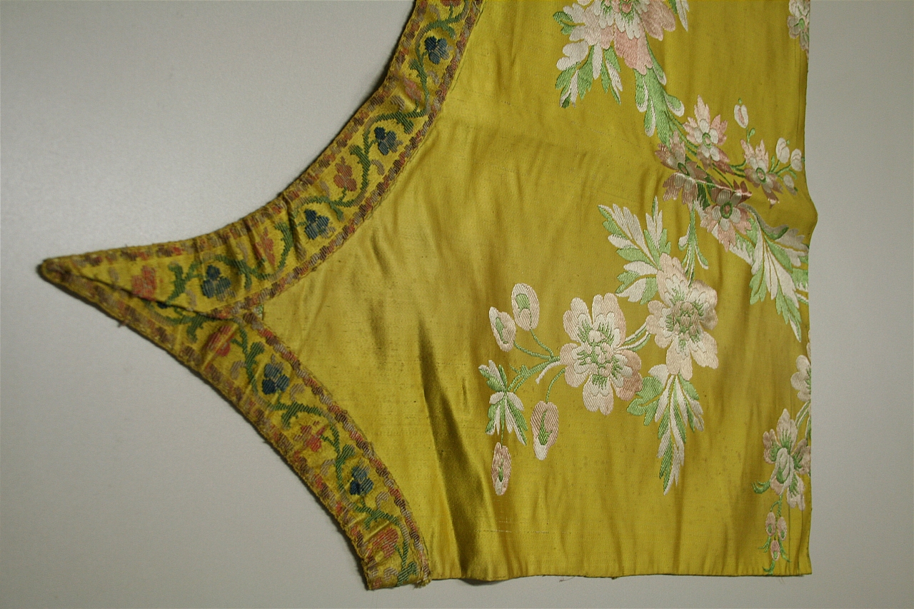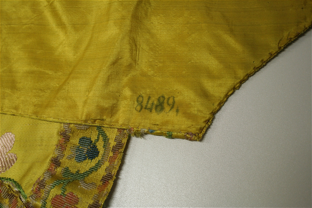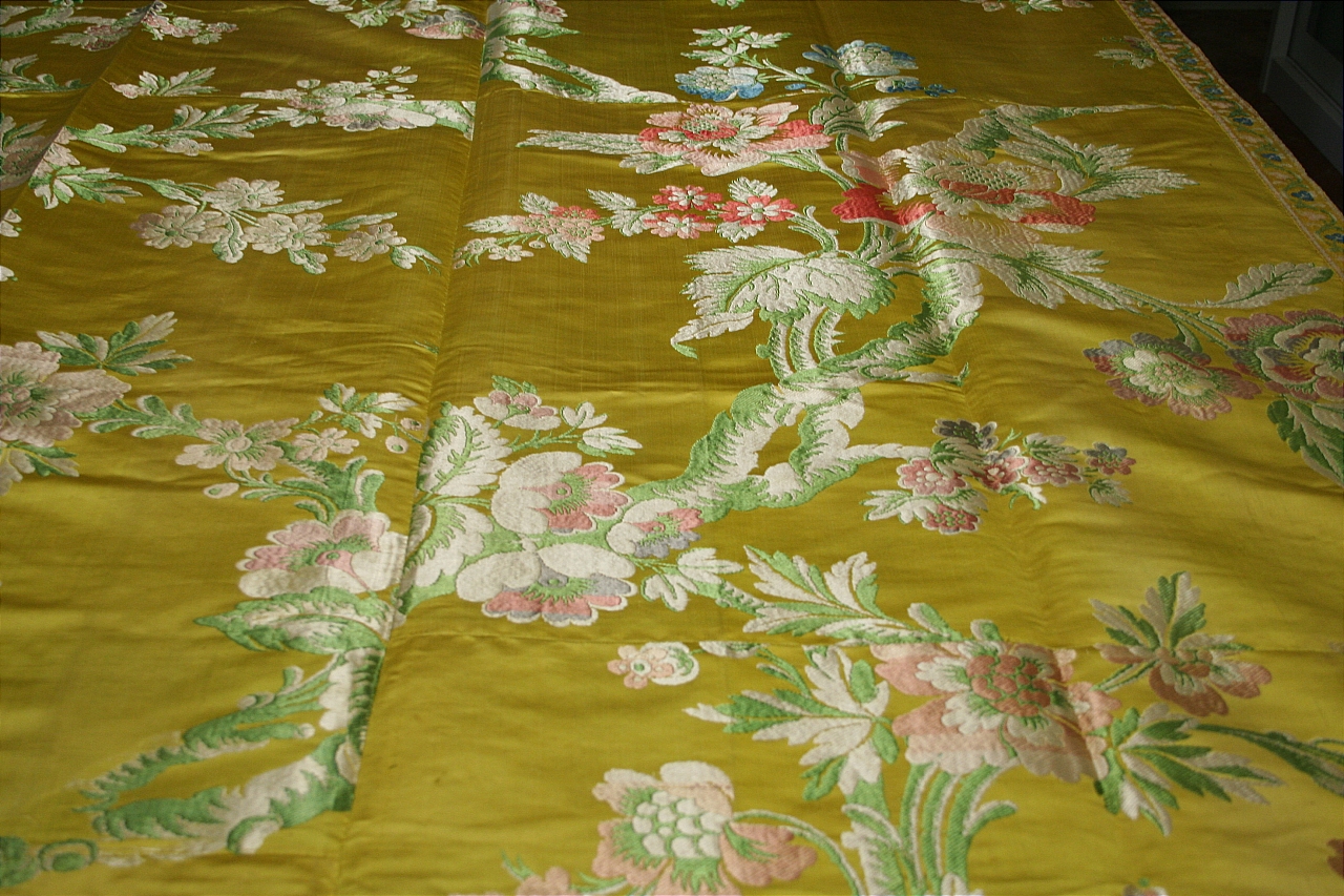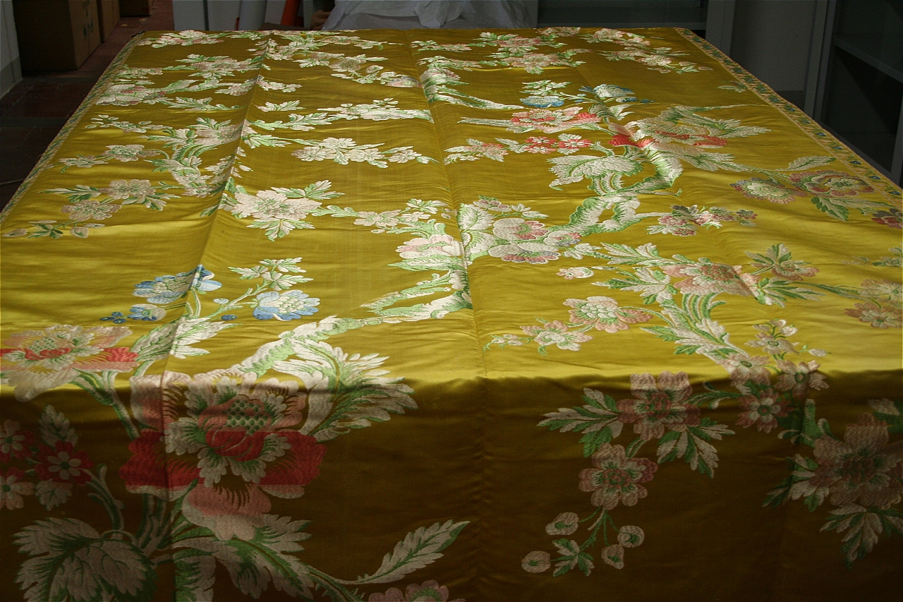 Cortinaggio composto da 6 portiere e 3 pendoni in tessuto operato di seta fondo in raso giallo, opera in seta policroma. Bordura in tessuto operato di seta, fondo in raso giallo opera in velluto riccio in seta policroma. Due portiere presentano una balza in gros de Tours color giallo
