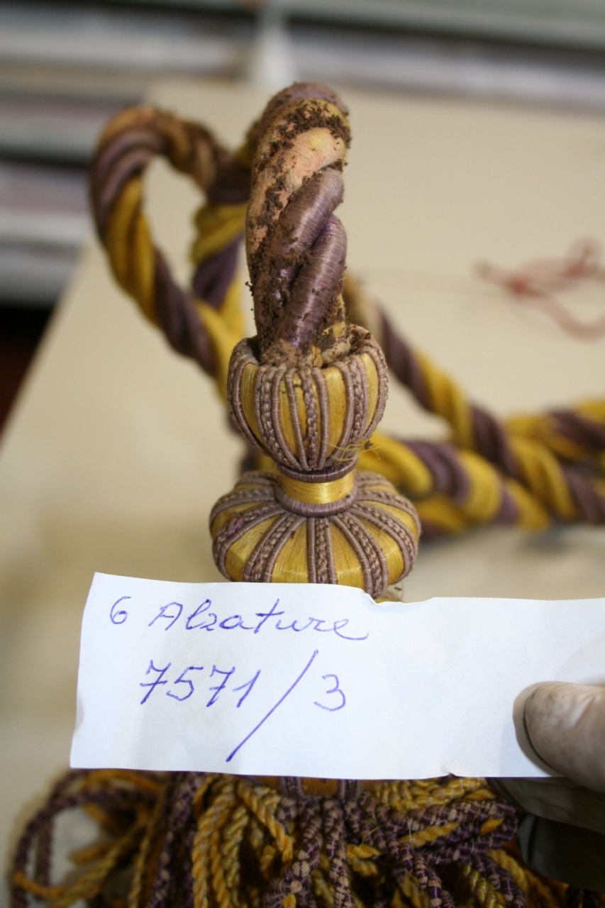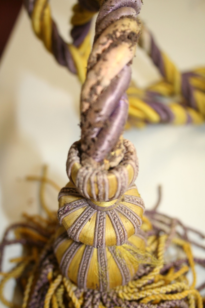 Sei alzature e due pezzi di cordone in seta color giallo e viola. Nappe e anello in legno rivestito in seta gialla e viola e lana in color giallo