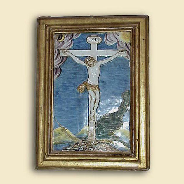 La targa, di forma rettangolare, in maiolica di colore chiaro su sfondo azzurro, rappresenta il Crocifisso con due nuvole rosate dipinte negli angoli superiori, dove sono raffigurati rispettivamente la luna e il sole. Il perizoma del Cristo, in colore oro, è annodato sul fianco destro in un nodo svolazzante. La croce è piantata sulla collinetta