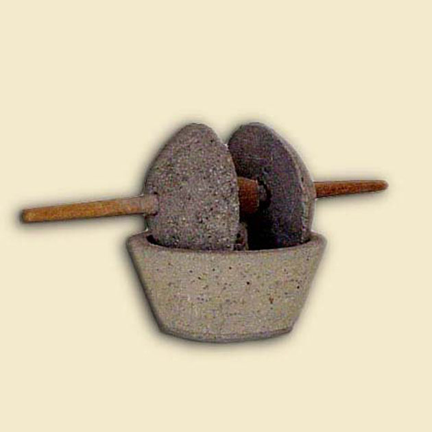 Il modellino è costituito da un piccolo vaso contenente le due ruote in pietra della macina unite da un bastoncello