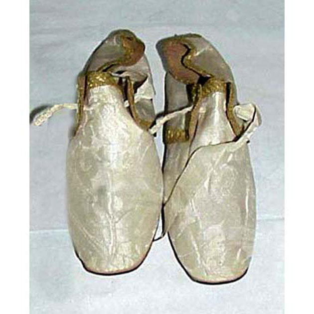 Le scarpe hanno la suola ed il tacco in legno e la tomaia in tessuto di seta bianco e damascato. Il bordo dell'allacciatura e del collo della scarpa è decorato da un gallone in oro filato