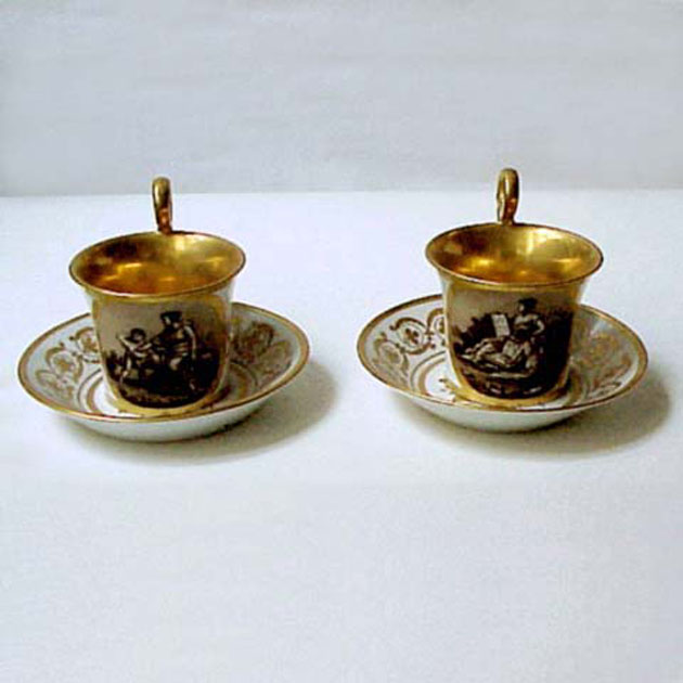 Il piattino, dai bordi sensibilmente rialzati, ha sezione circolare ed è alquanto svasato; il margine superiore è dorato e lo sono anche le decorazioni fitomorfe che occupano la parte interno del bordo rialzato; al centro si trova un fiore stilizzato ad otto foglie lanceolate. La tazza, di forma cilindrica leggermente bombata in basso ed appena svasata superiormente, è munita di un manico ricurvo interamente dorato attaccato al corpo ed al margine superiore; la parte interna è dorata e all'esterno, in posizione opposta al manico si trova una cornice dorata tondeggiante che racchiude una raffigurazione; sono altresì dorati il bordo inferiore e quello superiore