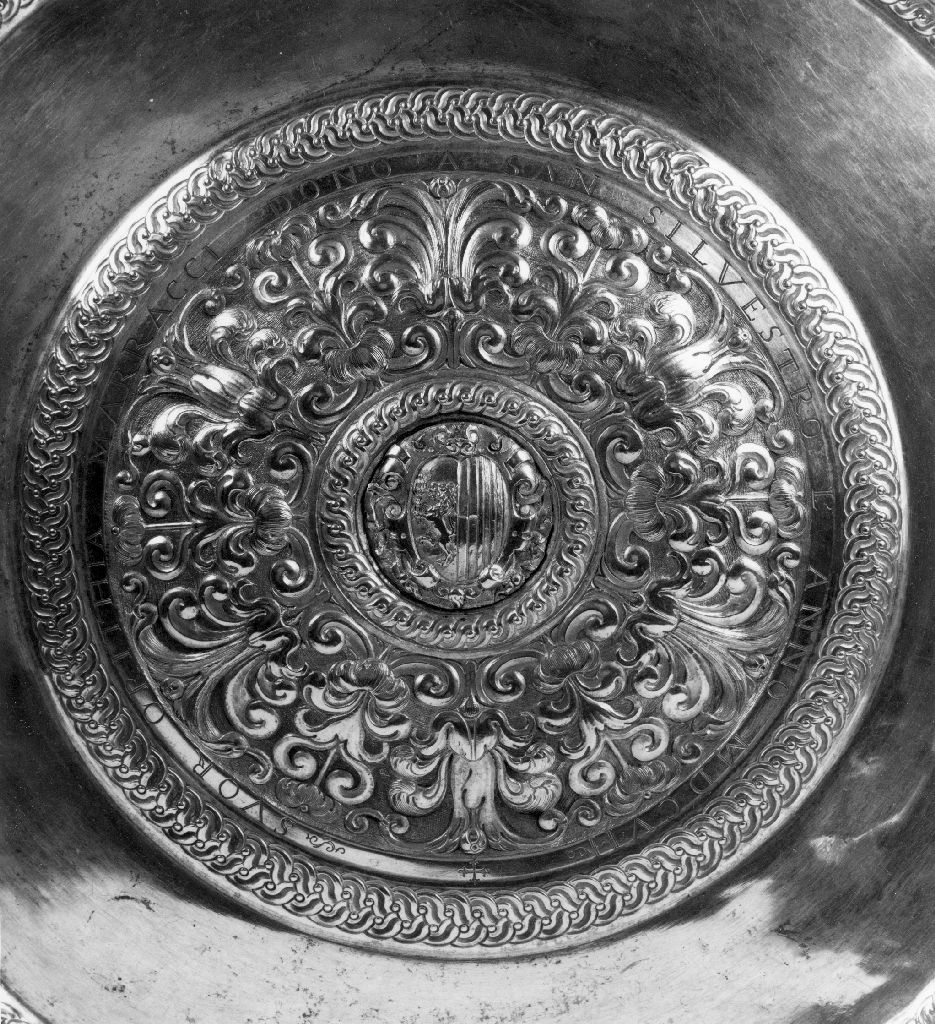 - NOTIZIE STORICO CRITICHE La ricca ornamentazione floreale del bordo è ancora legata al gusto manieristico e ben si accorda con la data inscritta nella cornice centrale del piatto (1607). La ricca ornamentazione floreale del bordo è ancora legata al gusto manieristico ed induce a credere in una realizzazione durante il primo seicento. Per quanto riguarda la tipologia di quest'oggetto è opportuno ricordare che lo stesso Cardinale Borromeo raccomandava nelle sue Instructiones il ricorso ad apparati decorativi particolarmente sontuosi che fossero in grado di far esaltare questo genere di piatto, solitamente destinato ad essere collocato in un'apposita credenza collocata nell'area presbiterale