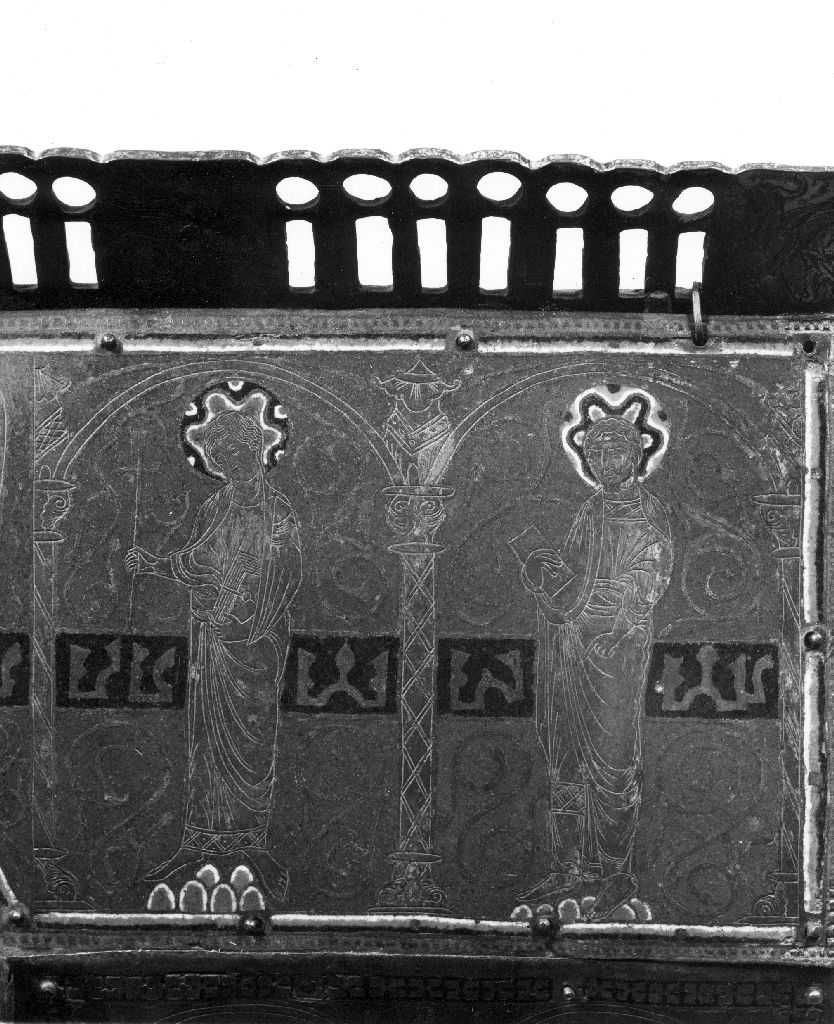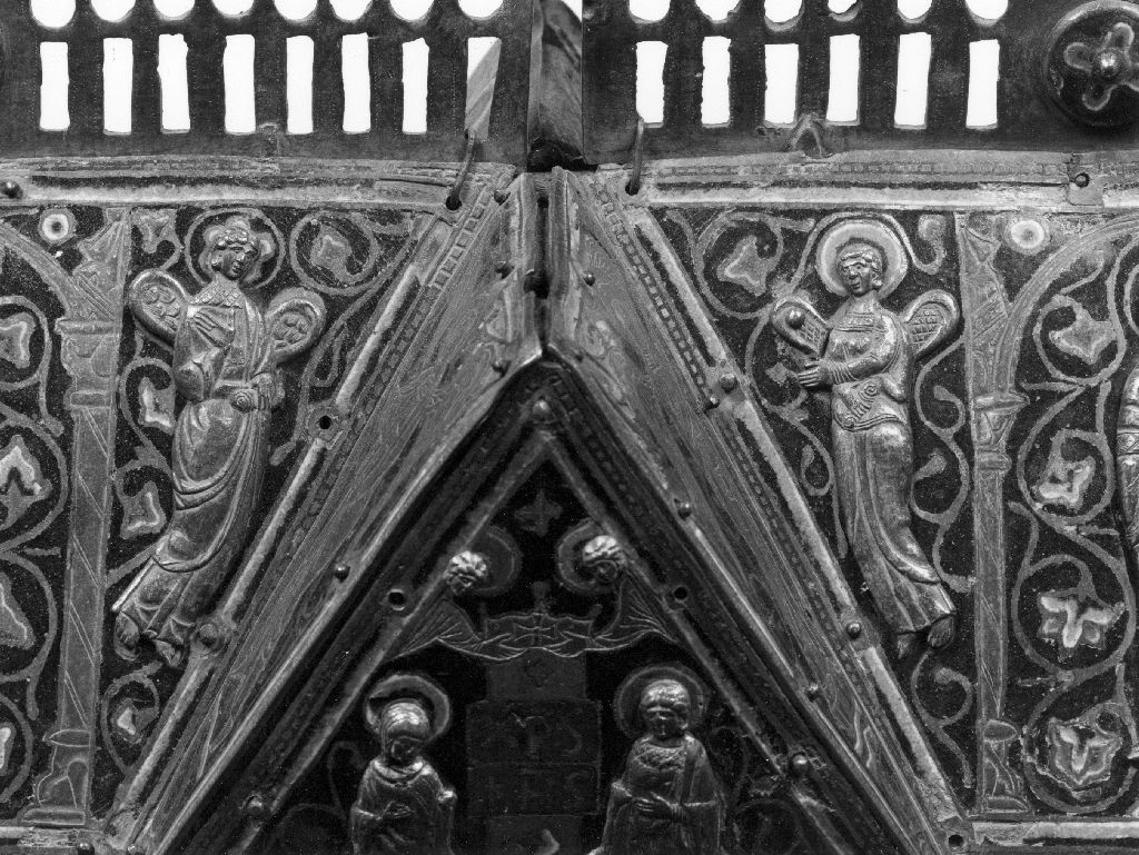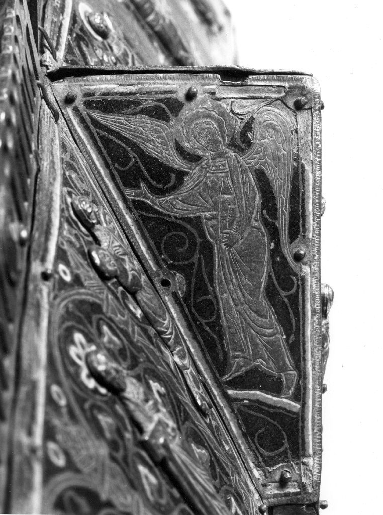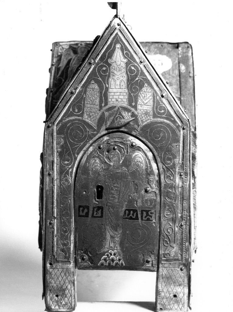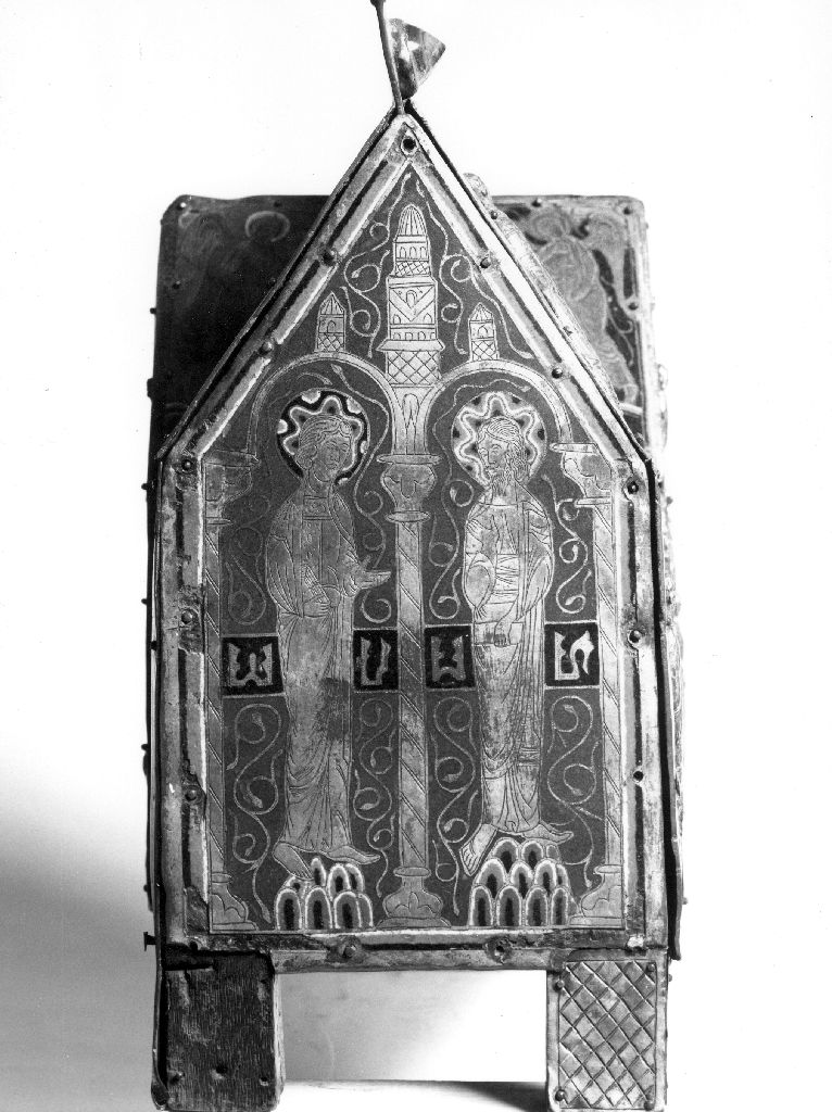 Cassa rettangolare a transetto poggiante su quattro piedini quadrati in posizione angolare rivestiti da lamine decorate a losanghe graffite. Coperchio a quattro spioventi sormontato da due creste traforate da due gruppi di finestrelle rettangolari sormontate da oculi; alle estremità delle due creste una pietra cabochon in castone, al centro una placchetta circolare con fiorone in smalto champlevé. Due apici a pomo decorano l'estremità delle creste. [Continua nel campo ANNOTAZIONI]