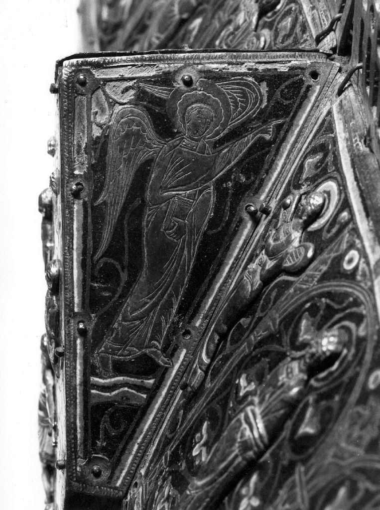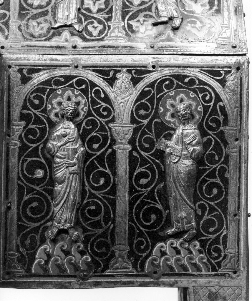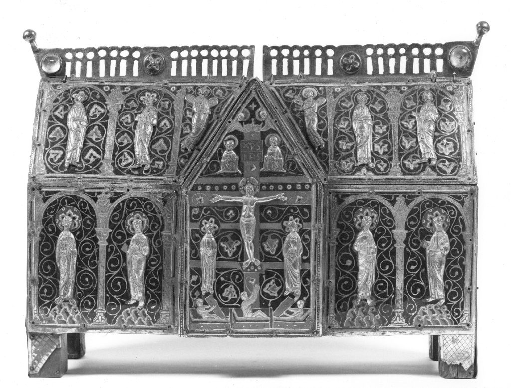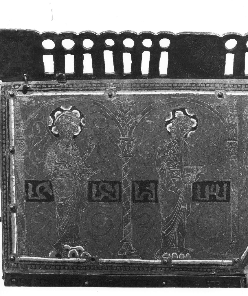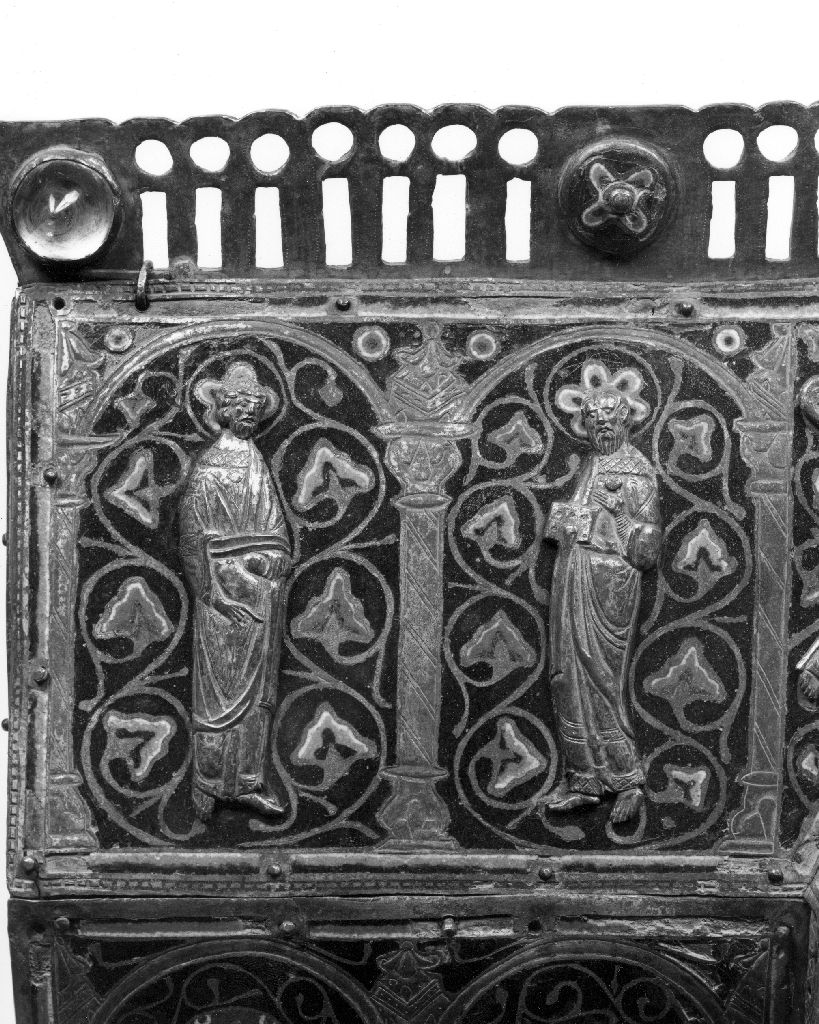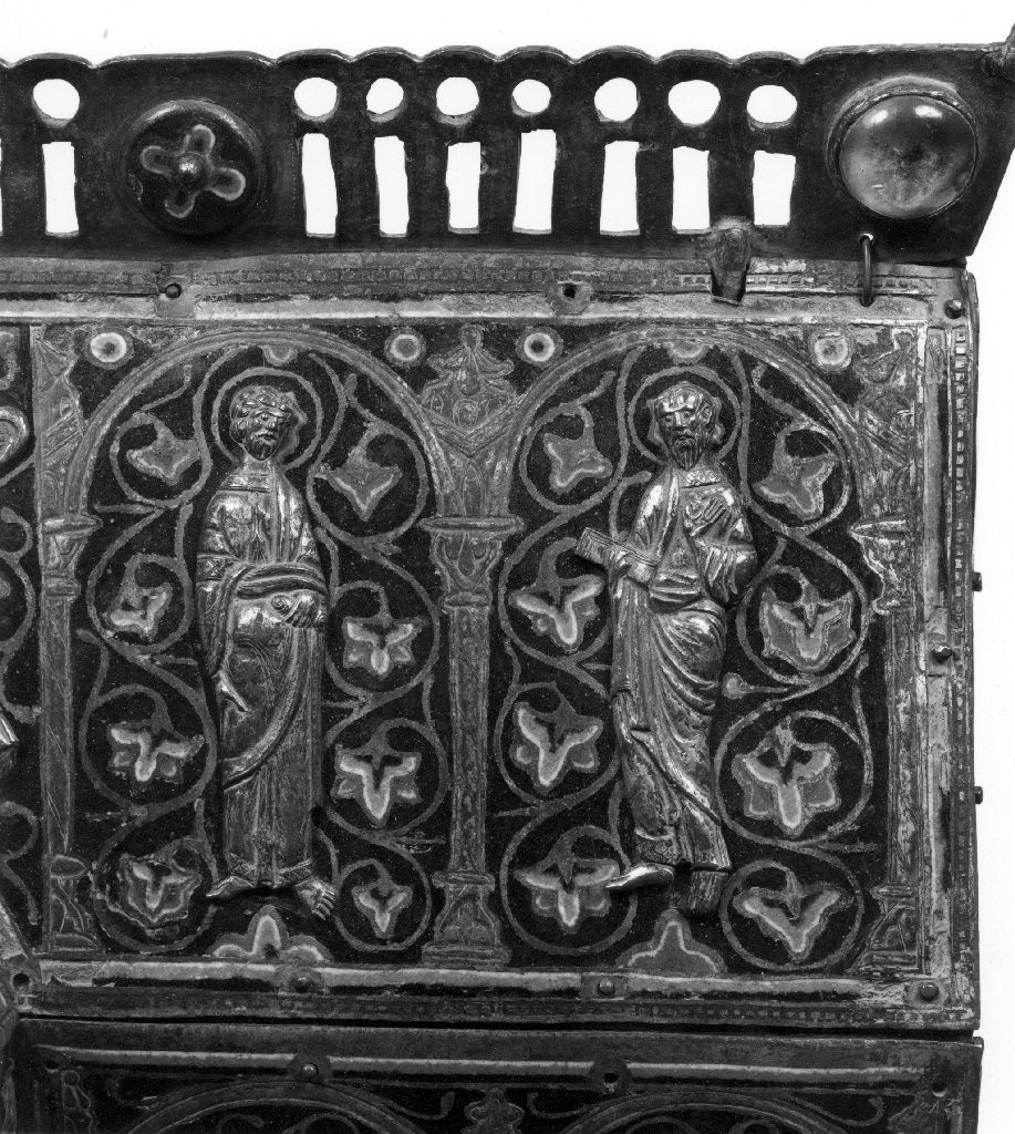 - NOTIZIE STORICO CRITICHE Si ritiene tradizionalmente che questo oggetto sia stato donato dal re Riccardo Cuor di Leone agli alleati pisani dopo la terza crociata insieme all'altro cofanetto di manifattura limosina conservato nel tesoro. Il reliquiario, contenente parti del suolo della Terrasanta, appartiene ad una tipologia formale che conobbe la massima diffusione nei secoli XII e XIII grazie all'opera di botteghe specializzate operanti a Limoges. La particolare forma del tetto a più spioventi, la disposizione delle figure, le tecniche di esecuzione ed assemblamento delle placchette smaltate e di ogni altra applicazione metallica, nonché la gamma cromatica degli smalti utilizzati permette di ricondurre la cassetta reliquiario in esame alla produzione compresa tra la fine del XII ed il primo quarto del XIII secolo. È, inoltre, possibile confrontare il reliquiario con alcune delle opere esposte alla mostra Enamels of Limoges del 1996 tenutasi al Metropolitan Museum di New York e presso il Louvre di Parigi: alcune placche per legature di Evangeliarii realizzate tra la fine del XII e l'inizio del XIII secolo condividono con la placchetta di Cristo in Maestà la stessa attenzione per il rilievo ed il dettaglio inciso ed inoltre risultano eseguite secondo la stessa modalità di lasciare i corpi en reserve e di realizzare le teste in rilievo. Più in generale le figure in rilievo sul fianco frontale sono confrontabili con grande parte della produzione di questo periodo per la forza del rilievo e la definizione lineare. Osservando, da ultimo, la cassa di San Calminio (Enamels of Limoges) con i suoi racemi fioriti en reserve che attraversano il fondo smaltato e le collinette sotto i piedi dei Santi è possibile avanzare un'ipotesi di datazione che, seguendo l'opinione di M.M.Gauthier, comprenda anche gli ultimi anni del secolo XII oltre che il primo quarto del XIII secolo