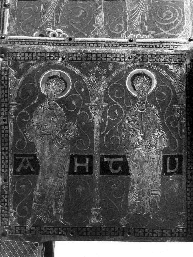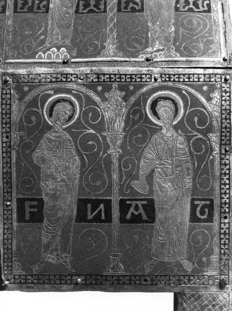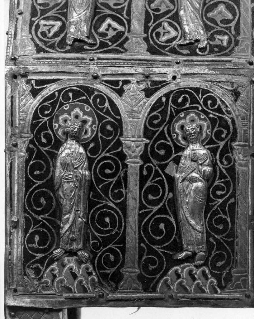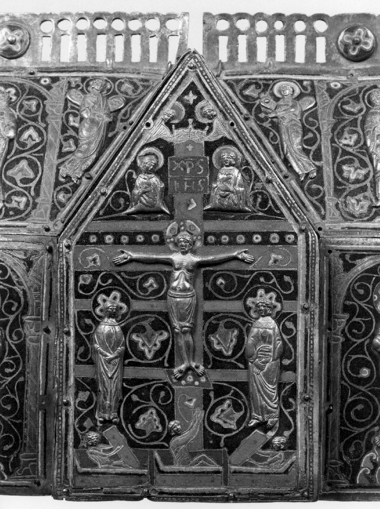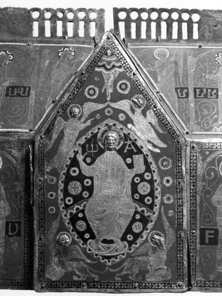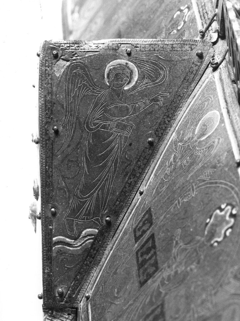 - NOTIZIE STORICO CRITICHE Si ritiene tradizionalmente che questo oggetto sia stato donato dal re Riccardo Cuor di Leone agli alleati pisani dopo la terza crociata insieme all'altro cofanetto di manifattura limosina conservato nel tesoro. Il reliquiario, contenente parti del suolo della Terrasanta, appartiene ad una tipologia formale che conobbe la massima diffusione nei secoli XII e XIII grazie all'opera di botteghe specializzate operanti a Limoges. La particolare forma del tetto a più spioventi, la disposizione delle figure, le tecniche di esecuzione ed assemblamento delle placchette smaltate e di ogni altra applicazione metallica, nonché la gamma cromatica degli smalti utilizzati permette di ricondurre la cassetta reliquiario in esame alla produzione compresa tra la fine del XII ed il primo quarto del XIII secolo. È, inoltre, possibile confrontare il reliquiario con alcune delle opere esposte alla mostra Enamels of Limoges del 1996 tenutasi al Metropolitan Museum di New York e presso il Louvre di Parigi: alcune placche per legature di Evangeliarii realizzate tra la fine del XII e l'inizio del XIII secolo condividono con la placchetta di Cristo in Maestà la stessa attenzione per il rilievo ed il dettaglio inciso ed inoltre risultano eseguite secondo la stessa modalità di lasciare i corpi en reserve e di realizzare le teste in rilievo. Più in generale le figure in rilievo sul fianco frontale sono confrontabili con grande parte della produzione di questo periodo per la forza del rilievo e la definizione lineare. Osservando, da ultimo, la cassa di San Calminio (Enamels of Limoges) con i suoi racemi fioriti en reserve che attraversano il fondo smaltato e le collinette sotto i piedi dei Santi è possibile avanzare un'ipotesi di datazione che, seguendo l'opinione di M.M.Gauthier, comprenda anche gli ultimi anni del secolo XII oltre che il primo quarto del XIII secolo