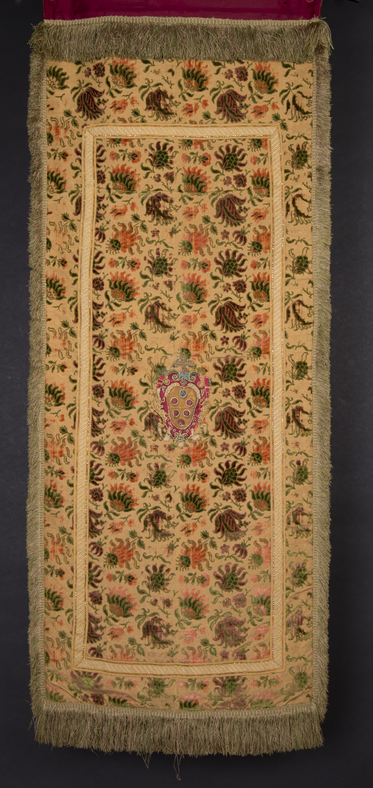 Bandinella da leggio bianca in velluto cesellato lanciato, appartiene al parato Medici (0930000073-0930000079). Velluto cesellato a due corpi (verde -rosa; verde-amaranto), tre colpi al ferro, fondo taffetas doublè laminato . Ordito e trama di fondo in seta color champagne; all'intreccio partecipa anche una trama lanciata in argento lamellare che viene legata da una selezione dell'ordito di fondo. Opera in velluto, dato da tre orditi di pelo, rispettivamente in seta color verde, rosa e amaranto. Il disegno è creato da una serrata composizione a fiori isolati ed è giocato sull'alternarsi, in orizzontale, di due diverse teorie verticali di infiorescenze con direzioni opposte. La prima teoria è composta da fritillarie e peonie, la seconda da pigne con corona di petali sfrangiati e fiori a calice. Ciascuna te oria presenta inoltre minuscoli tralcetti di tulipani, rose, iris e melograne, ad inframezzare la disposizione delle infiorescenze più grandi. Un gallone a telaio in seta gialla, filaticcio rosa e oro lamellare, con disegno a berrette compone una cornice interna a lla bandinella. I profili sono orlati con una frangia in seta verde e rosa. Al centro della bandinella è cucito lo stemma Medici a ricamo ad applicazione in gros bianco e bleu laminati argento, giallo laminato oro, raso rosso, in parte ricamati a punto steso in oro filato e seta verde. Foder a in tela grezza e, di sostituzione, in tessuto a telaio meccanico rosso; vi è stampigliato 272. Nel 1625 l'arc. Medici fece costruire un armadio di sac restia per contenere il parato