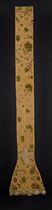 Stola bianca in velluto cesellato lanciato, appartiene al parato Medici (0 930000073-0930000079). Velluto cesellato a due corpi (verde-rosa; verde-a m aranto), tre colpi al ferro, fondo taffetas doublè laminato. Ordito e tr am a di fondo in seta color champagne; all'intreccio partecipa anche una t ram a lanciata in argento lamellare che viene legata da una selezione dell 'ord ito di fondo. Opera in velluto, dato da tre orditi di pelo, rispettiv ament e in seta color verde, rosa e amaranto. Il disegno è creato da una s errata composizione a fiori isolati ed è giocato sull'alternarsi, in orizz ontale , di due diverse teorie verticali di infiorescenze con direzioni o pposte. La prima teoria è composta da fritillarie e peonie, la seconda da pigne c on corona di petali sfrangiati e fiori a calice. Ciascuna teoria p resenta inoltre minuscoli tralcetti di tulipani, rose, iris e melograne, a d infram ezzare la disposizione delle infiorescenze più grandi. (Continua nel campo OSS)
