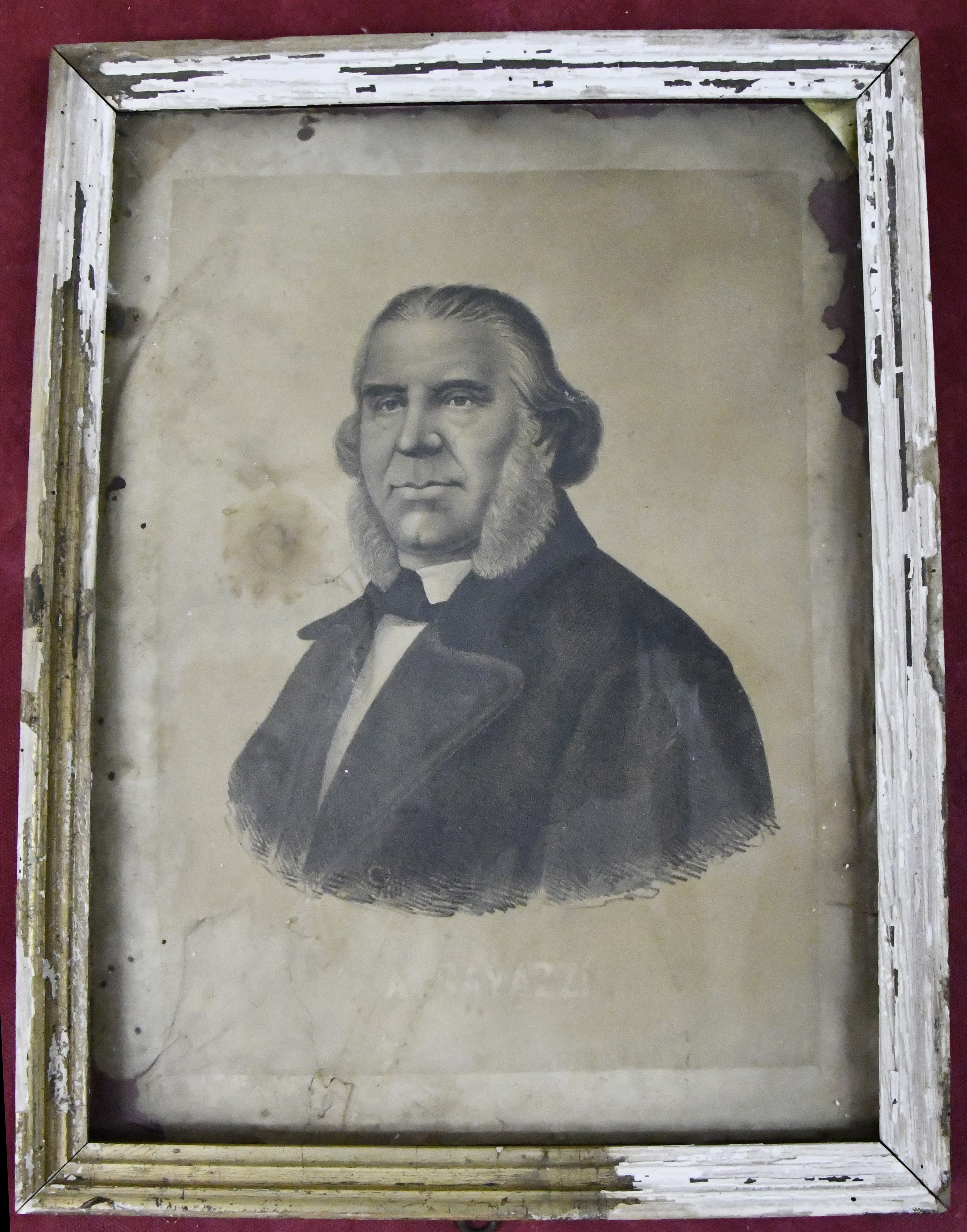 - NOTIZIE STORICO CRITICHE Ritratto a stampa di A. Gavazzi montato entro cornice in legno già dorato. L'uomo, che indossa una giacca dall'ampio collo, ha grandi favoriti e i capelli pettinati all'indietro. Secondo gli inventari il ritratto proviene dai magazzini del mercato. Alessandro Gavazzi (Bologna 1809 - Roma 1889) fu predicatore barnabita attivo anche a Livorno; troppo estremista venne arrestato e imprigionato per ordine dello Stato Pontificio, fuggì a Londra dove riprese le sue violente polemiche. Al seguito di Garibaldi come cappellano, tentò in seguito di fondare una Chiesa Evangelica in Italia