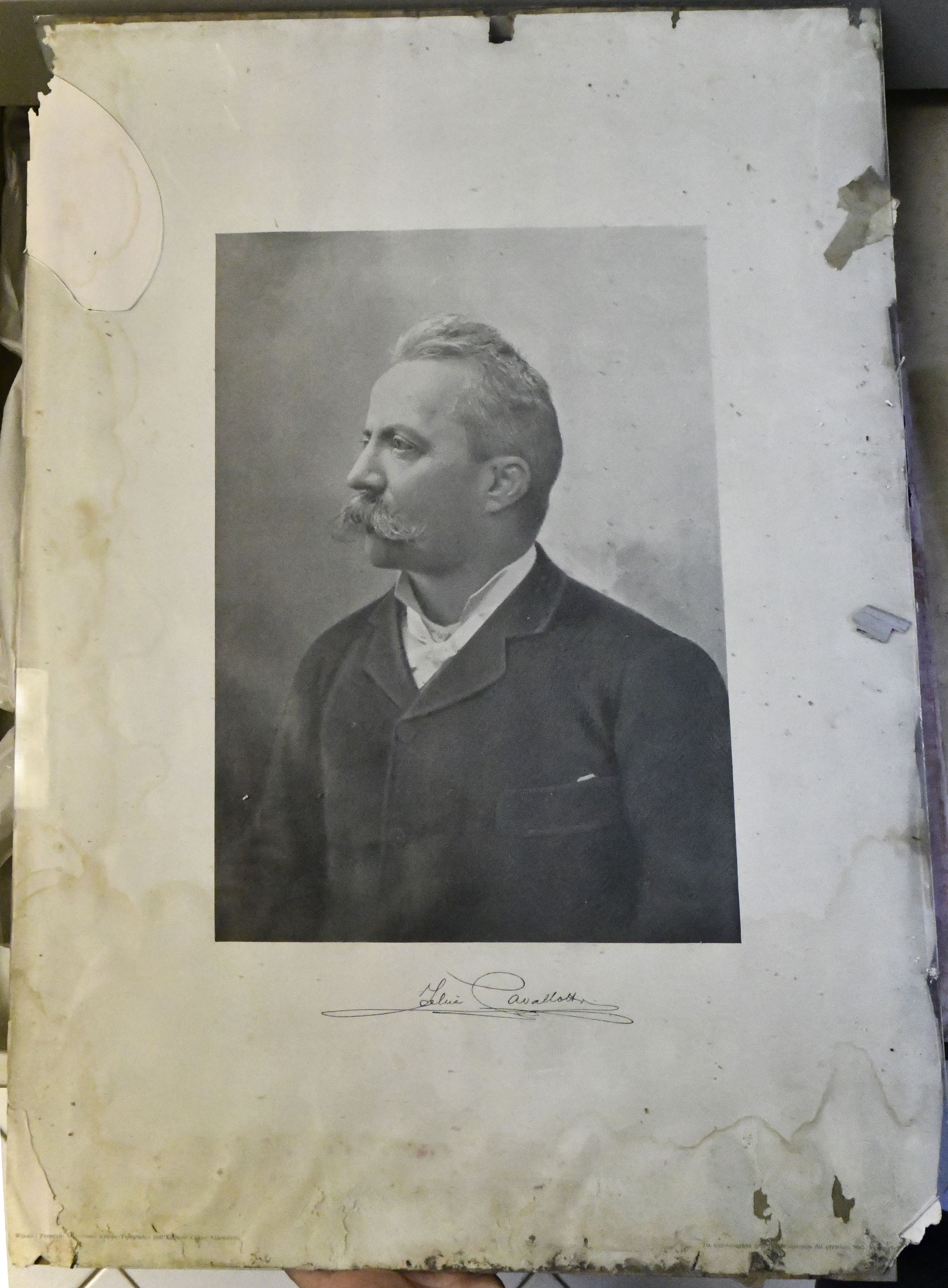 - NOTIZIE STORICO CRITICHE Foto riprodotta a stampa su carta di Felice Cavallotti. L'uomo è ritratto a mezzo busto, di tre quarti; indossa una giacca sotto la quale si vede un piccolo collo bianco. E' di mezza età e ha grandi baffi grigi. Sotto sta la firma, a stampa. Sotto, a destra e a sinistra, i dati dello stampatore. Come attestano gli inventari municipali, la stampa proviene dai magazzini del mercato. Felice Cavallotti (Milano 1842 - Roma 1898), scrittore e uomo politico, portò avanti nella sua carriere numerose polemiche nelle quali denunciò sempre le ingiustizie governative