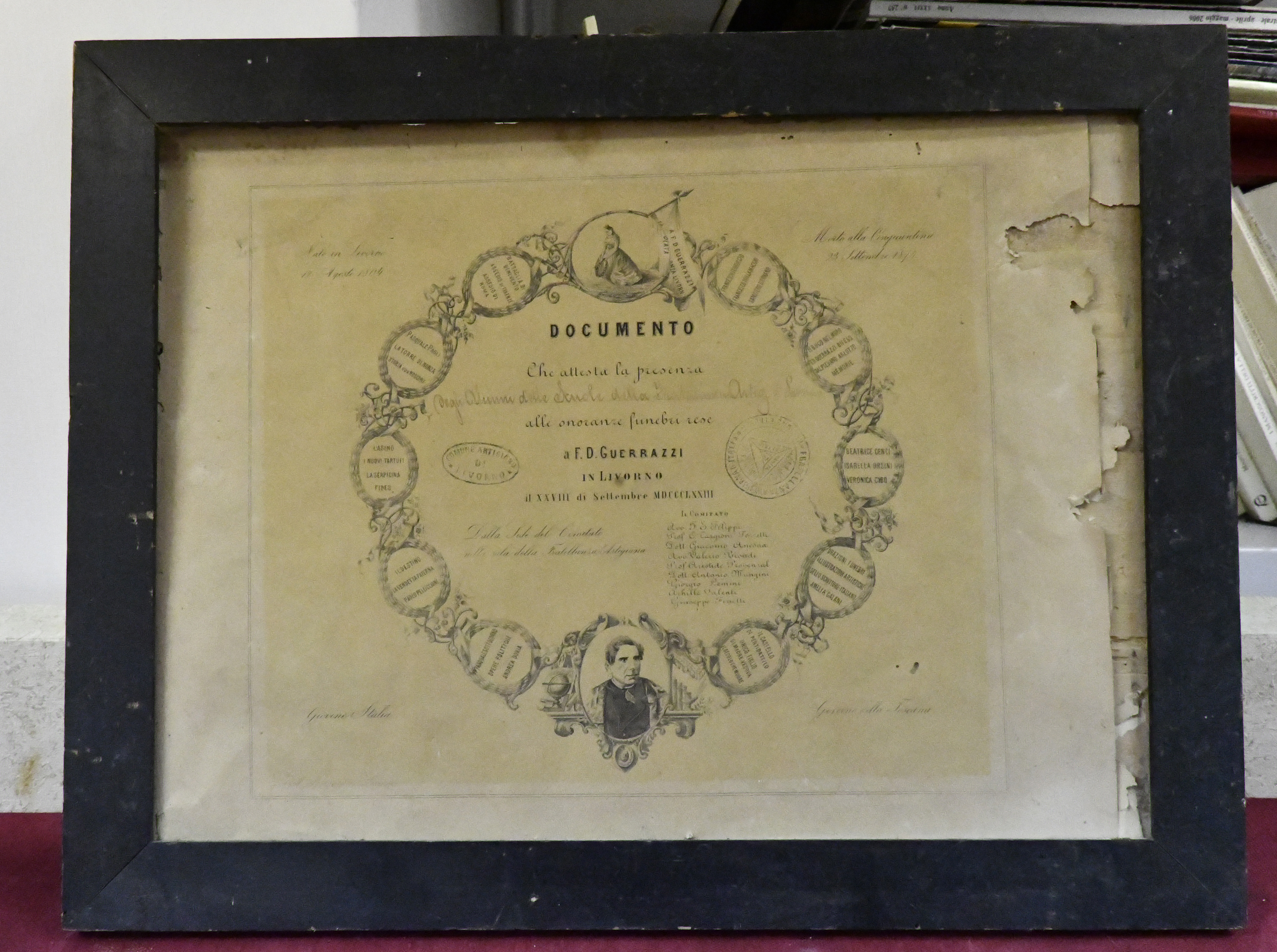 - NOTIZIE STORICO CRITICHE Attestato di partecipazione alle onoranze funebri di F. D. Guerrazzi. L'iscrizione commemorativa è racchiusa in una cornice formata da una serie di medaglioni entro cui compaiono i titoli delle opere letterarie del Guerrazzi; nella parte inferiore della cornice il ritratto del letterato. F. D. Guerrazzi (Livorno 1804 - Cecina 1873). Scrittore e patriota. Prese parte ai moti del 1848- 49 in Toscana, e assieme a G. Mazzini e G. Montanelli formò il governo provvisorio del 1849. Il 27 marzo fu eletto dittatore ma, tornato il Granduca, fu condannato a 15 anni di carcere ai quali sfuggì riparando a Genova. Fu eletto deputato nel 1860 ma, avversario del Cavuor, si dimise. L'attestato proviene dai magazzini del mercato. Cornice in legno dipinto