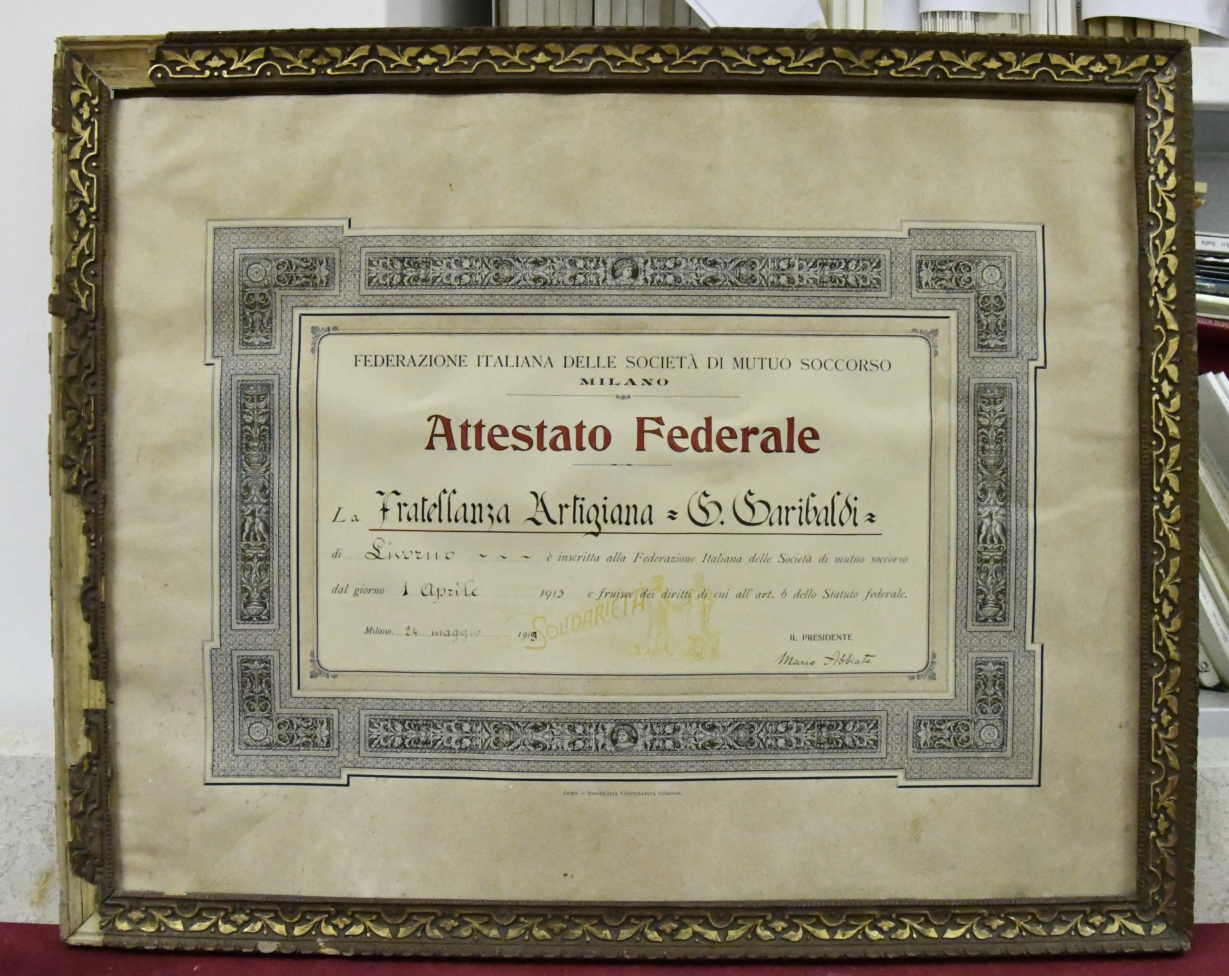 - NOTIZIE STORICO CRITICHE Attestato federale di iscrizione della Fratellanza Artigiana alla Fed. It. Soc. Mutuo Soccorso. L'iscrizione commemorativa, a colori, è contenuta in una cornice rettangolare sagomata e dorata, decorata internamente. La "Fratellanza Artigiana G. Garibaldi" di Livorno sorse nel 1861 come associazione di lavoratori praticanti lo stesso mestiere, con fini di mutuo soccorso e politici, all'interno della "Fratellanza Artigiana d'Italia" fondata a Firenze l'anno precedente. A differenza della direzione centrale fiorentina, sempre legata a un indirizzo mazziniano, l'organizzazione livornese vide una compresenza di democratici radicali, garibaldini e mazziniani, dovendo tenere presenti le molteplici e mutevoli esigenze e opinioni delle classi popolari con le quali era direttamente a diretto contatto. L'attestato proviene dai magazzini del mercato