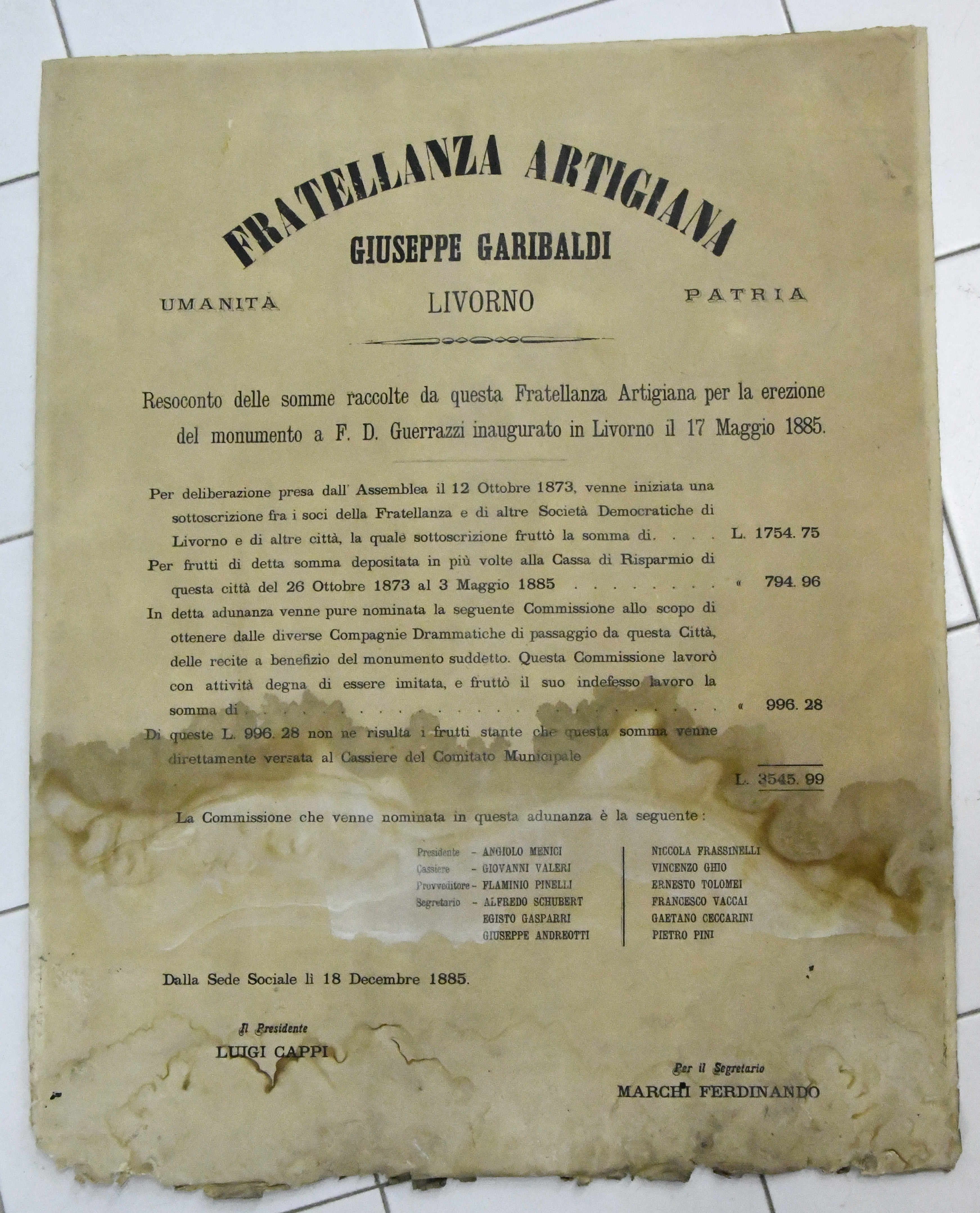 - NOTIZIE STORICO CRITICHE Resoconto di somme raccolte per l'erezione del monumento a Guerrazzi. Il resoconto delle somme raccolte è stampato a tutta pagina e è sovrastato dalla intestazione della "Fratellanza Artigiana". La "Fratellanza Artigiana G. Garibaldi" di Livorno, con fini di mutuo soccorso e politici, fondata nel 1861, raccolse somme per l'erezione del monumento livornese a F. D. Guerrazzi. Il relativo resoconto proviene dai magazzini del mercato. Cornice in legno dipinto