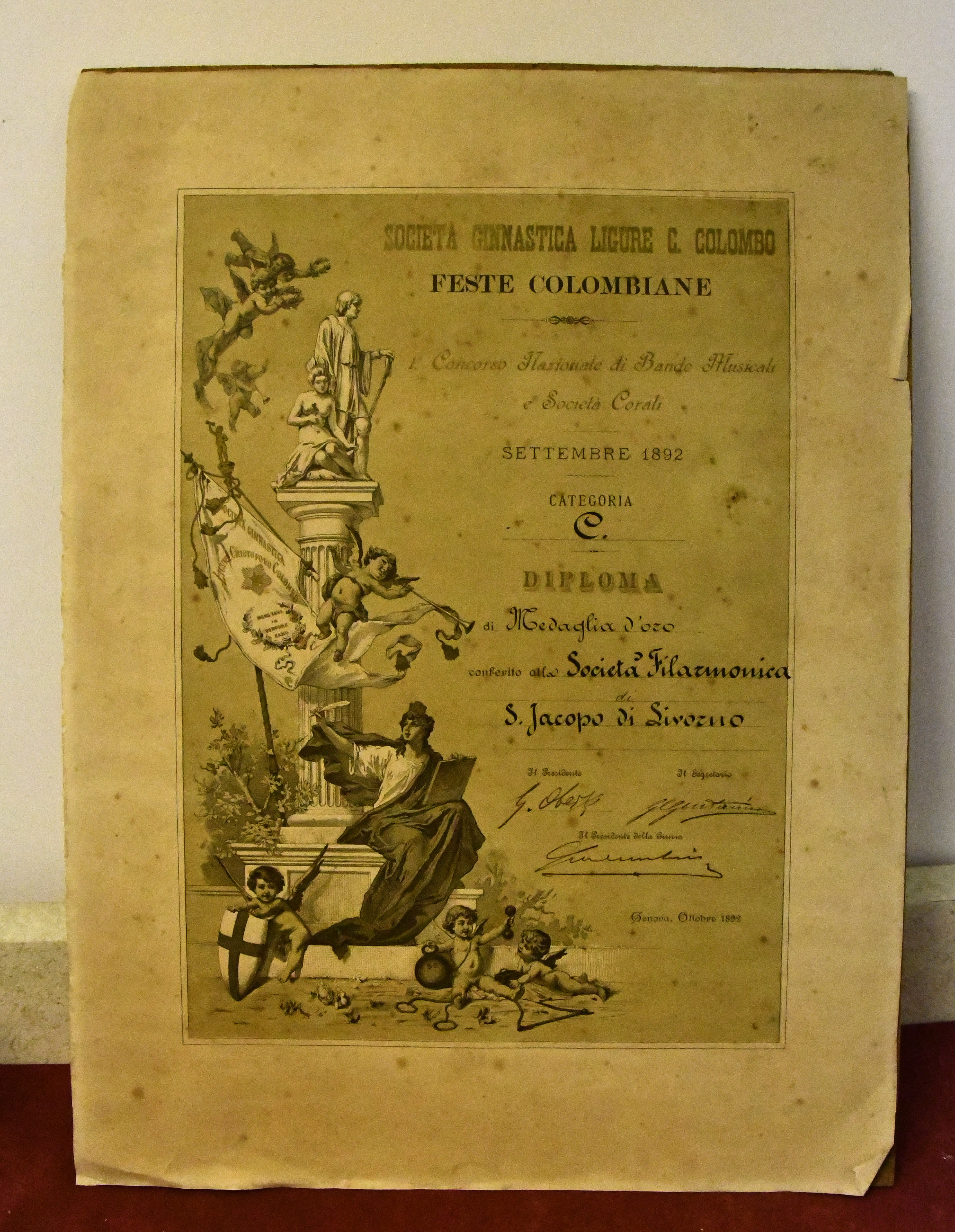 - ISCRIZIONI in alto, al centro - SOCIETA' GINNASTICA LIGURE C. COLOMBO / FESTE COLOMBIANE / 1 CONCORSO NAZIONALE DI BANDE MUSICALI / E SOCIETA' CORALI / SETTEMBRE 1892 / CATEGORIA / C. / DIPLOMA / DI MEDAGLIA D'ORO / CONFERITO ALLA SOCIETA' FILARMONICA / DI / S. JACOPO DI LIVORNO -