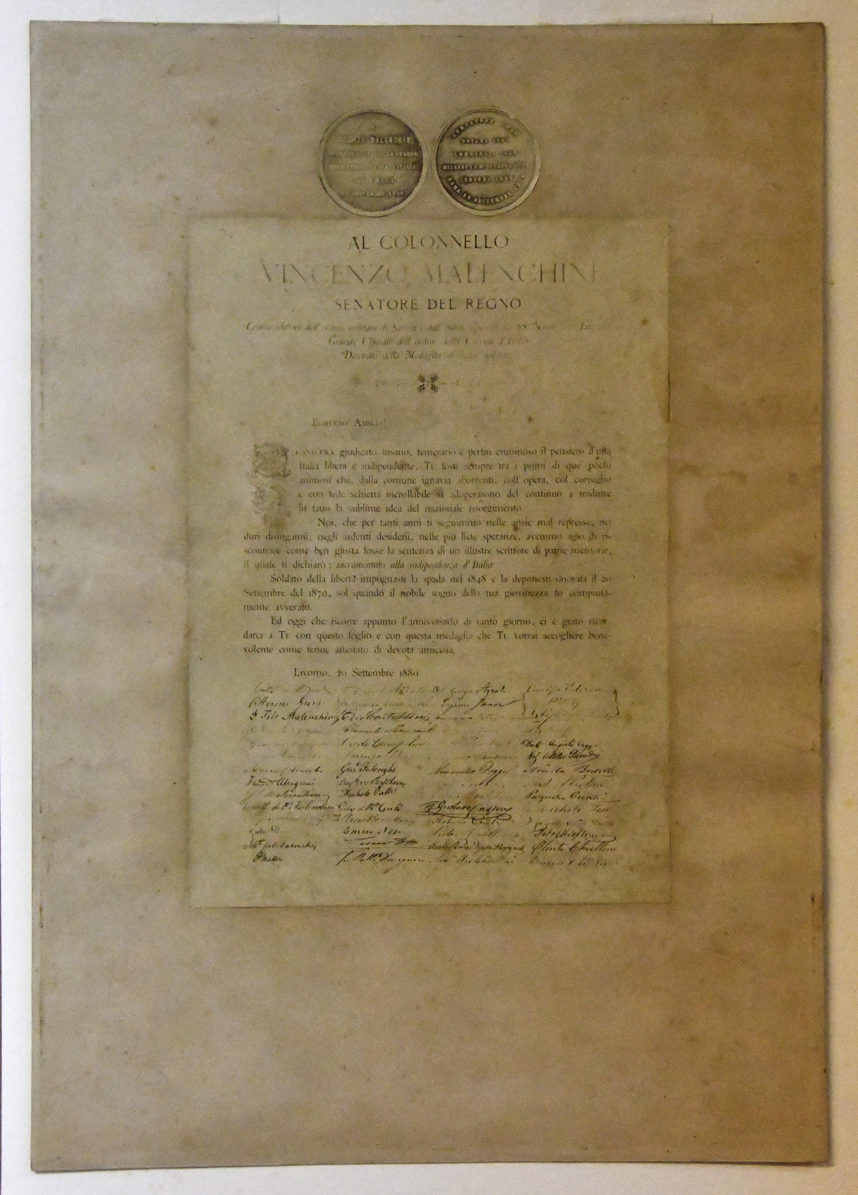 - NOTIZIE STORICO CRITICHE Al colonnello Vincenzo Malenchini, senatore del Regno, viene assegnata una medaglia in ricordo delle imprese militari da lui compiute per l'indipendenza dell'Italia. Il testo dell'attestato reca in alto le foto delle facce della medaglia assegnata e in basso, su quattro colonne, le firme dei sottoscrittori. Vincenzo Malenchini (Livorno 1813 - 1881). Patriota. Nel 1859 combatté alla testa di un esercito di volontari a fianco dei Piemontesi contro gli Austriaci. Partecipò alla spedizione dei Mille, alla battaglia di Custoza e alla presa di Roma. Nel 1870 fu colonnello dello Stato Maggiore di Nino Bixio. Fu nominato senatore dal Re d'Italia. L'attestato faceva parte del Fondo della Fratellanza Artigiana di Livorno